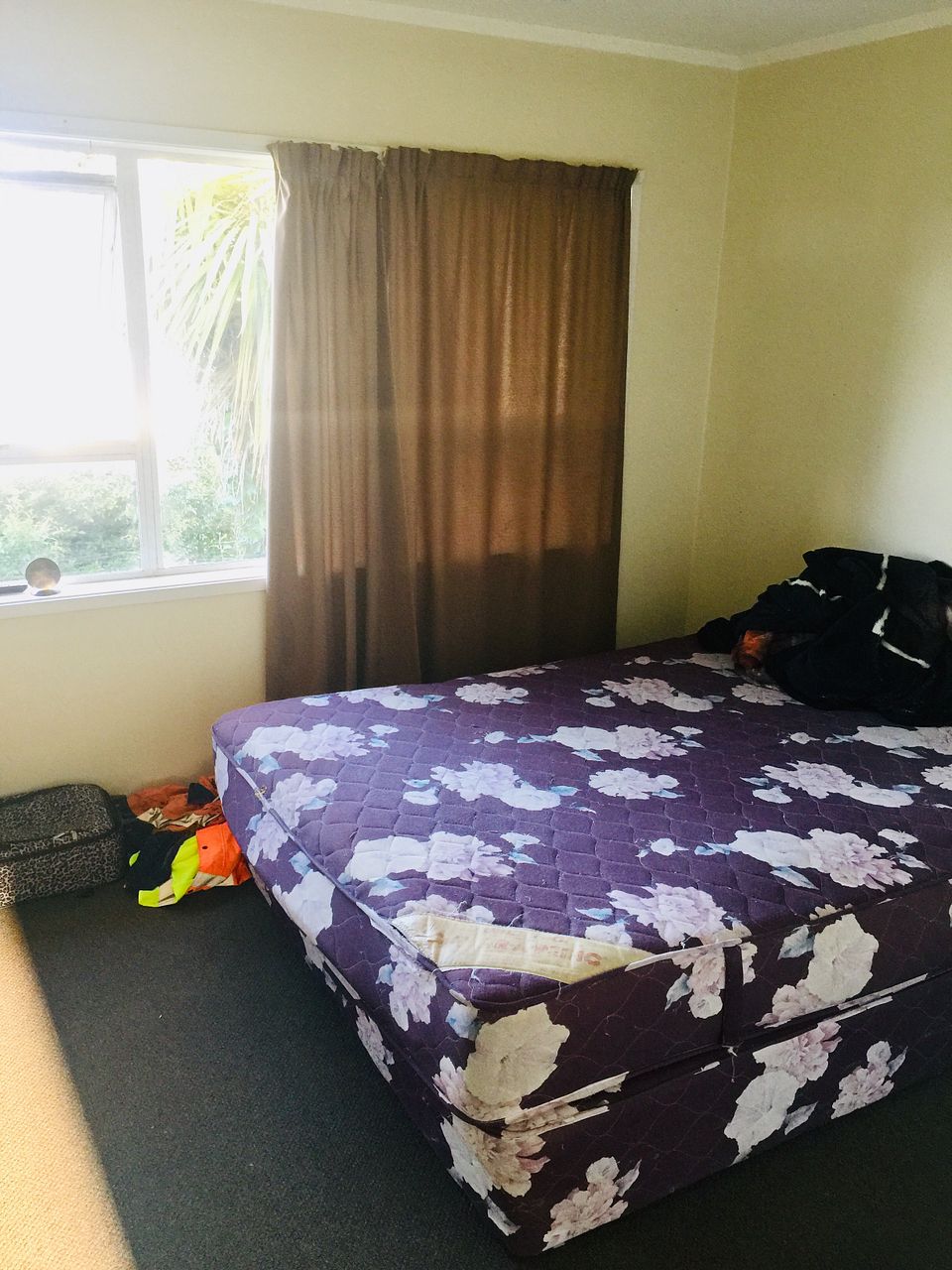 - Garage attached to house is carpeted with large nice cupboard and large window.