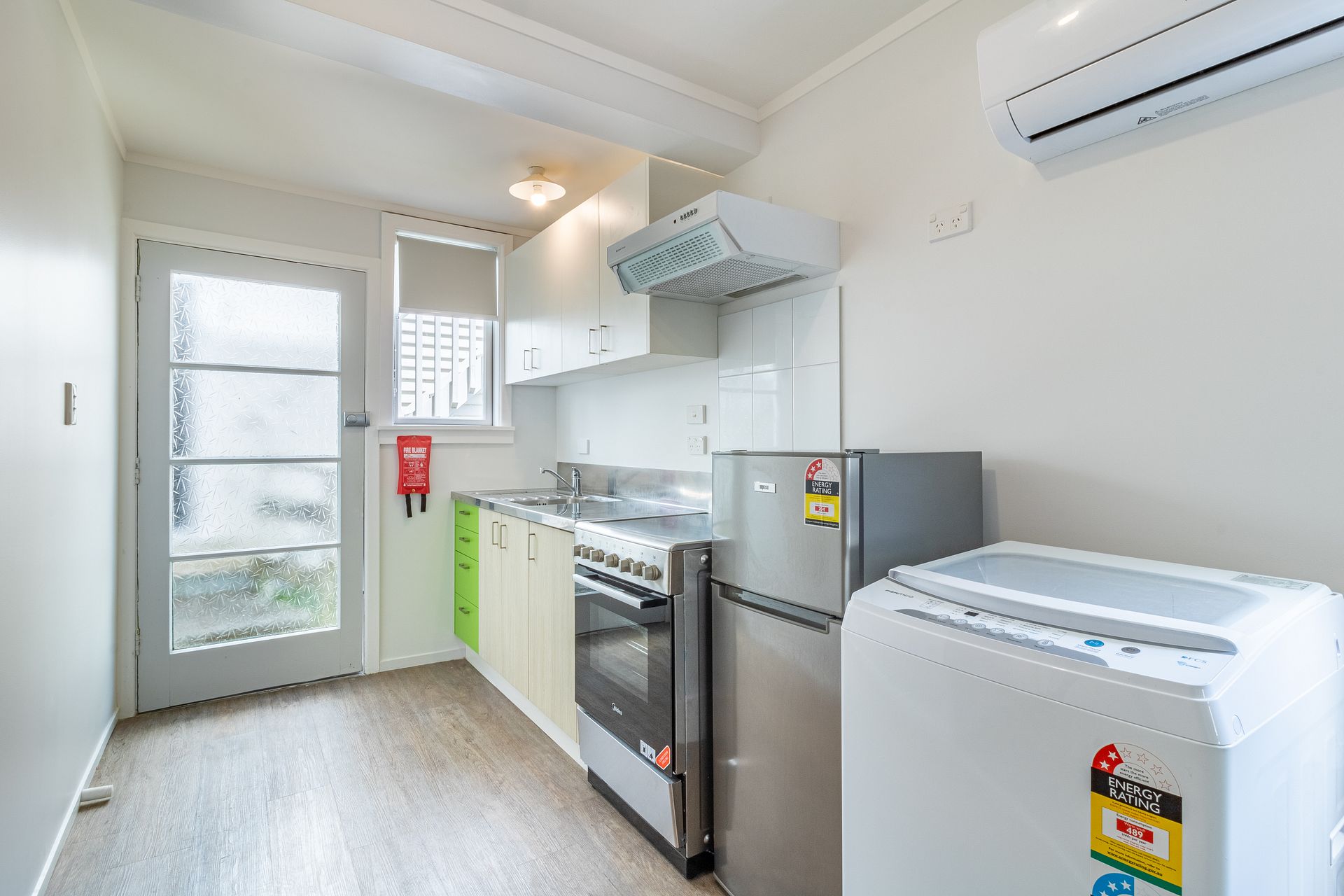 - A brand-new kitchen including cabinetry and bench top, equipped with new whiteware appliances: stainless steel fridge/freezer, oven/cooktop and washing machine.