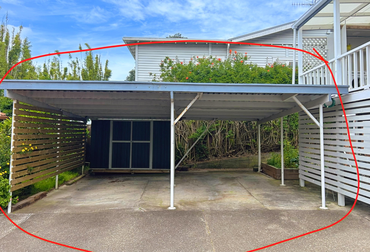 Full Carport with two private parking spaces, and an outdoor garden shed.