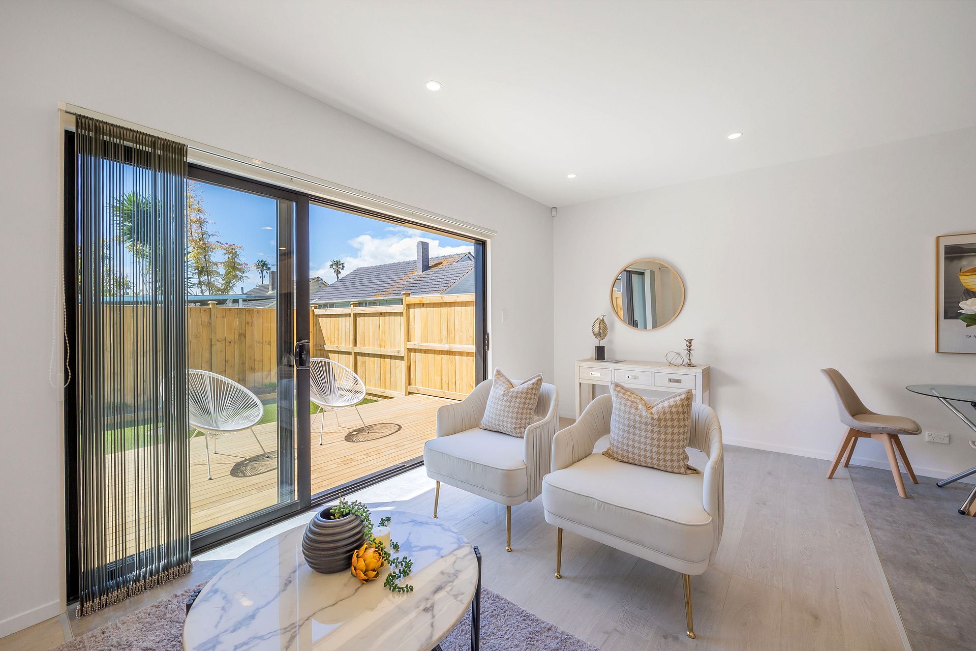 Living area opens to balcony and garden.