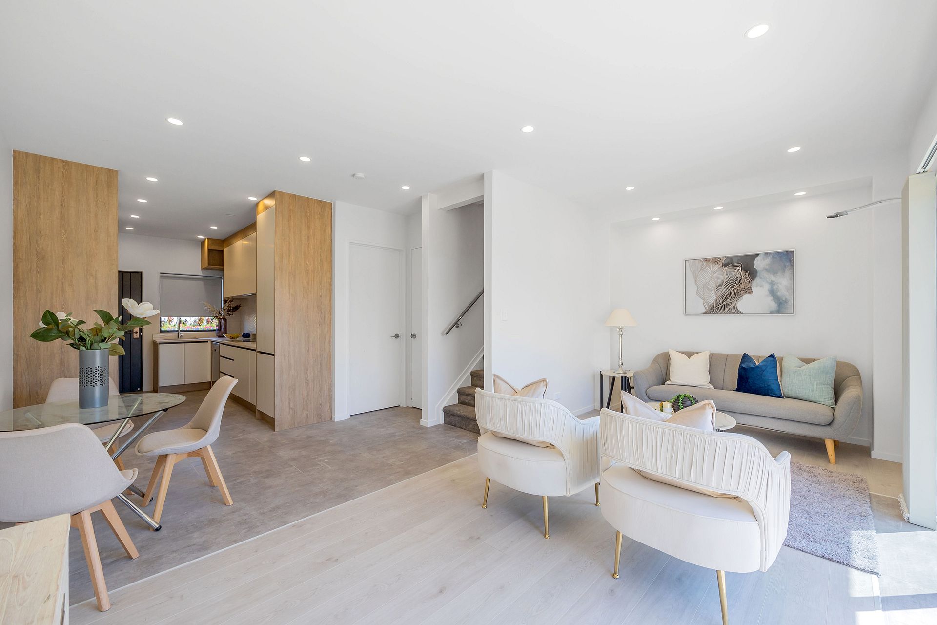 Open plan kitchen/dining/living.