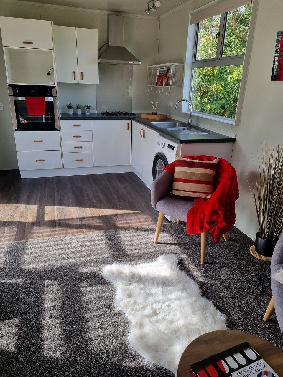 This home offers everything you need—with a generous living area, a surprisingly spacious kitchen equipped with a full-sized oven and washing machine, and smart use of space throughout. Tiny home living means lower living costs, easier maintenance, and more time to enjoy life.