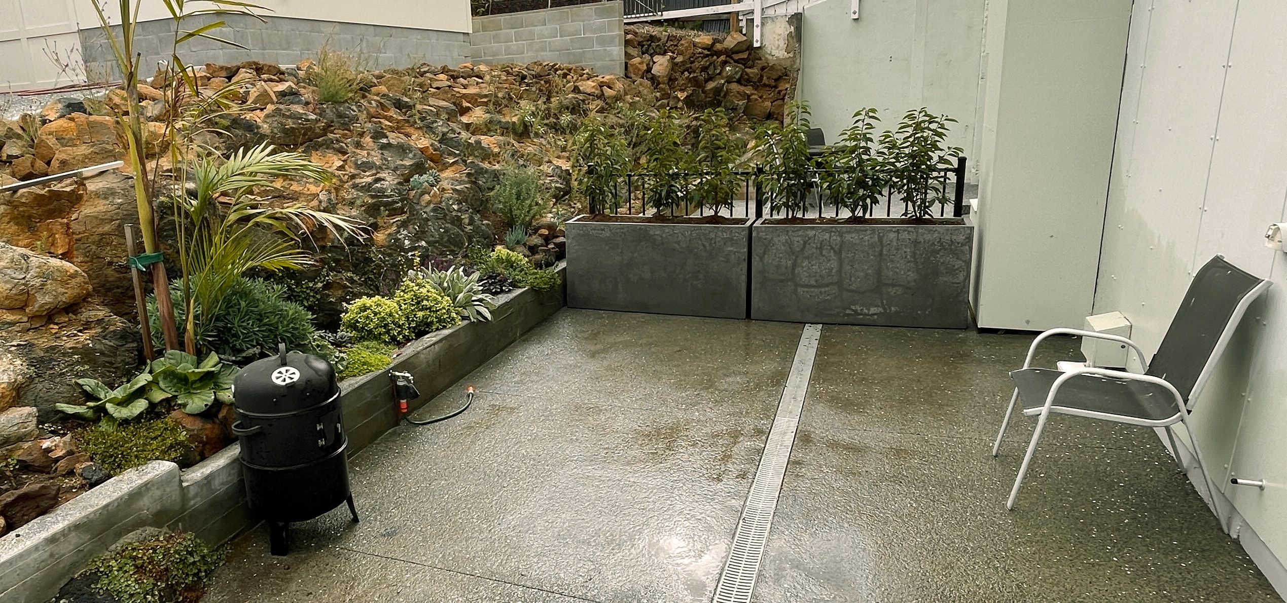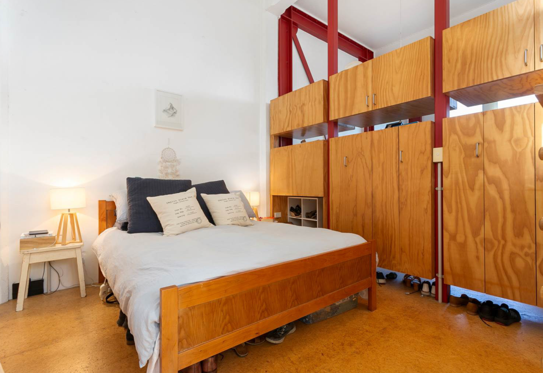 The apartment is around 65 m2 - plus a sunny year courtyard and a cute front porch area for that evening wine with engrossing sea views. (It is studio-style with the bedroom is cleverly separated from the rest of the space by built-in cabinetry and wardrobing, so more like a proper one bedroom apt.)