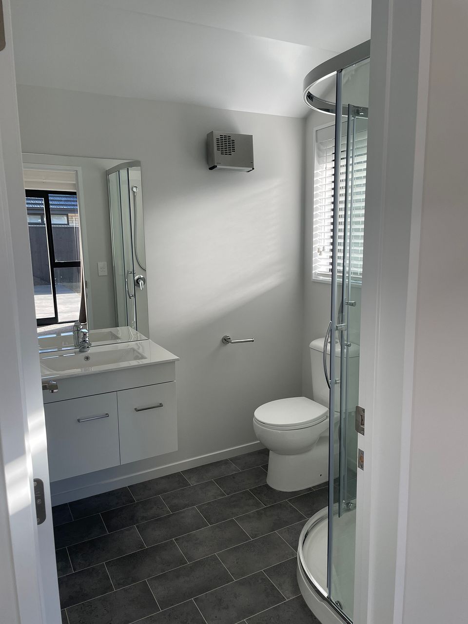 Open plan living, dining and kitchen, with heatpump.