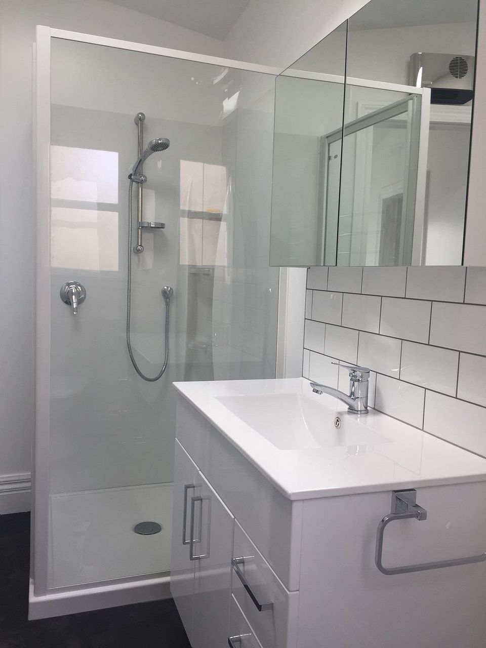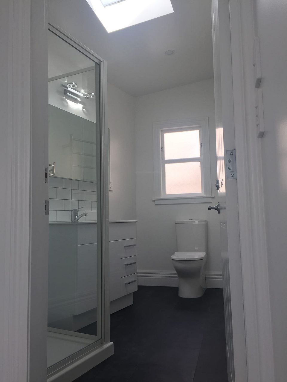 New bathroom with double towel rails, corner shower with shower dome, skylight and large vanity. Gas infinity hot water ensures you never run out of hot water.