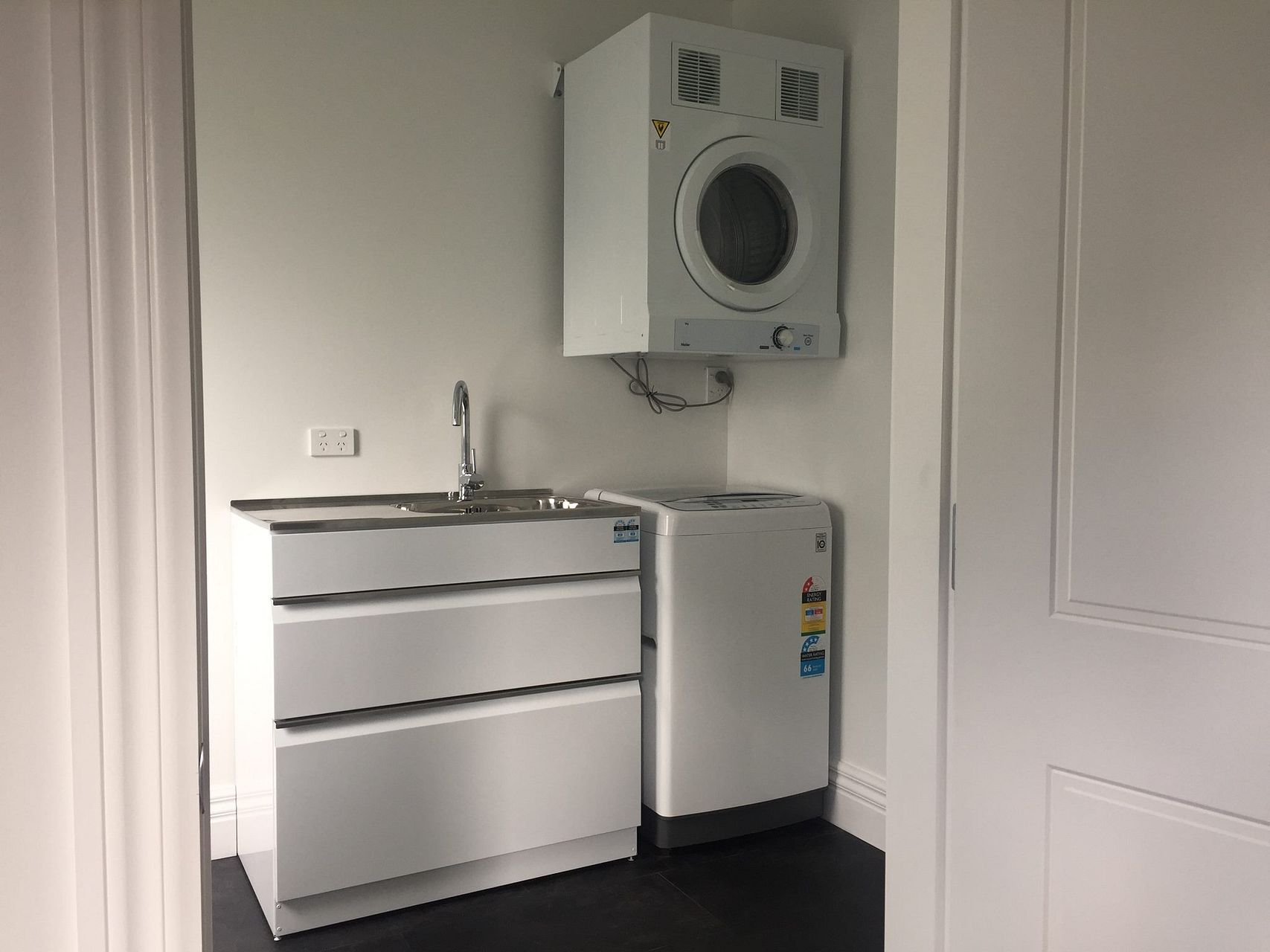 New laundry includes top loading washing machine and wall hung dryer. Room for a freezer if required.