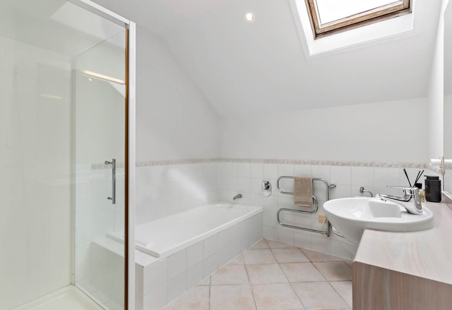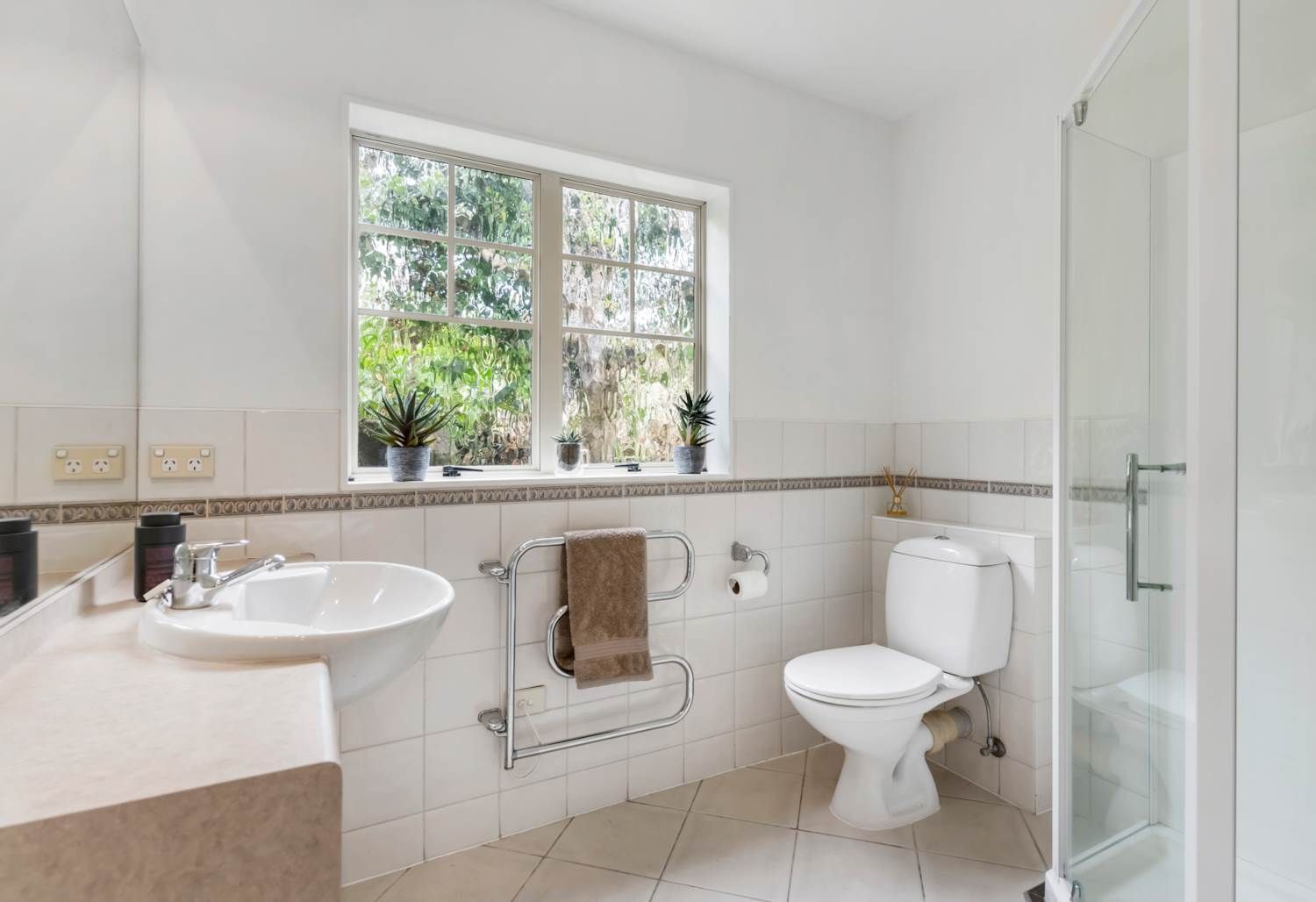 A light, bright contemporary interior boasts crisp white walls and multiple skylights with a comfortable ambiance from HRV ducted system, gas heating, and sunny north facing aspect. A spacious entrance foyer on the main floor is the central connection to living areas and one guest bedroom/office wing with bathroom. The kitchen has bifold windows, granite benchtops, ample cabinetry and stainless-steel appliances including gas hob. This is open plan with a tile floor dining room where French doors flow to a private and sunny cobblestone patio for alternative alfresco entertaining. A separate formal sitting room has ample natural light, a gas fireplace and leafy views. Three more bedrooms upstairs include the generous master with sizable walk-in closet and a tiled ensuite with dual basins. The second upstairs bathroom includes a bathtub with the shower, vanity and toilet. A separate laundry has a door to more of the cobblestone patios that flank the whole house while an internal access double garage has a storage cupboard.