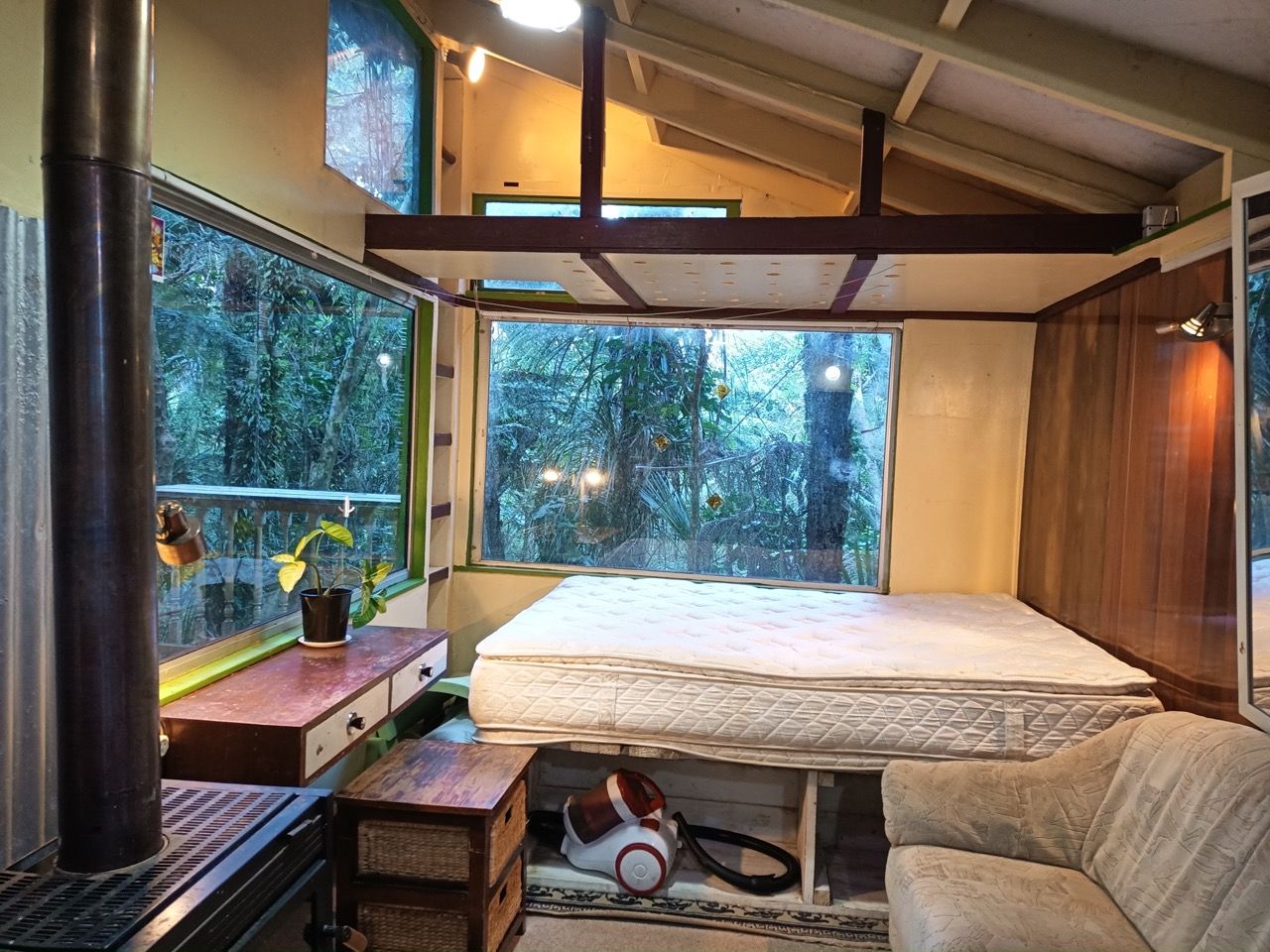 The studio suits one to two people with a cosy living area, sleeping or storage loft, wood burner, and a deck overlooking forest. Insulated, warm and clean. Toilet and laundry are shared with a friendly neighbour but the house and bathroom are private. It has actually been painted inside since the photos were taken, but I haven't taken photos yet, you can come and see it in person.