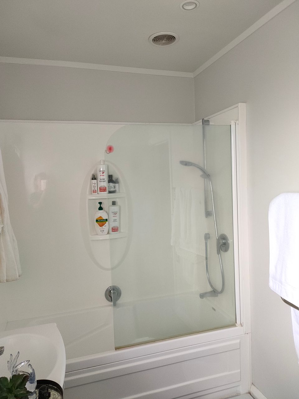 The bathroom has a shower over bath and double vanity and heated towel rail.