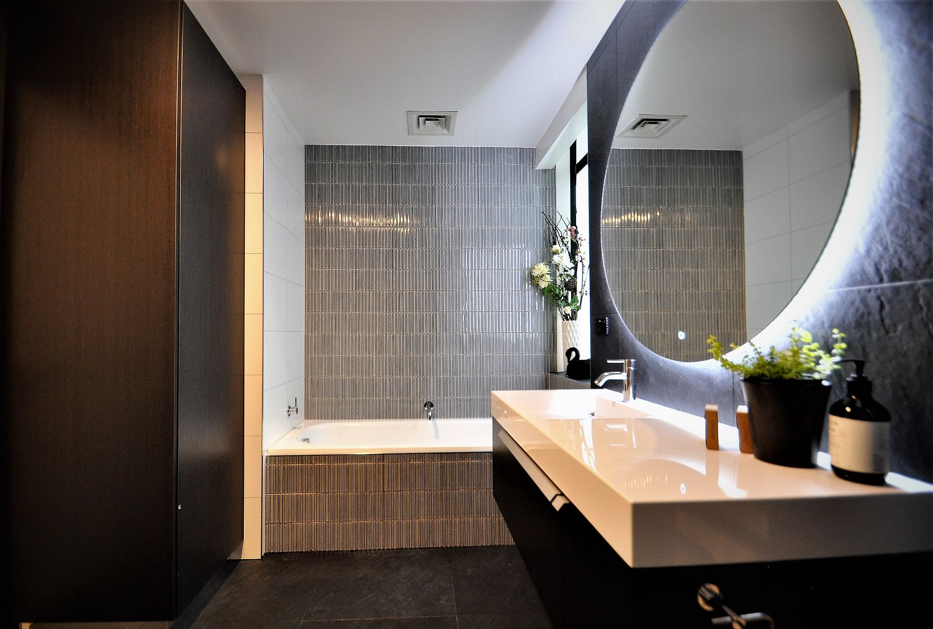 Contemporary spacious tiled bathroom with bath, separate shower & over-sized vanity.