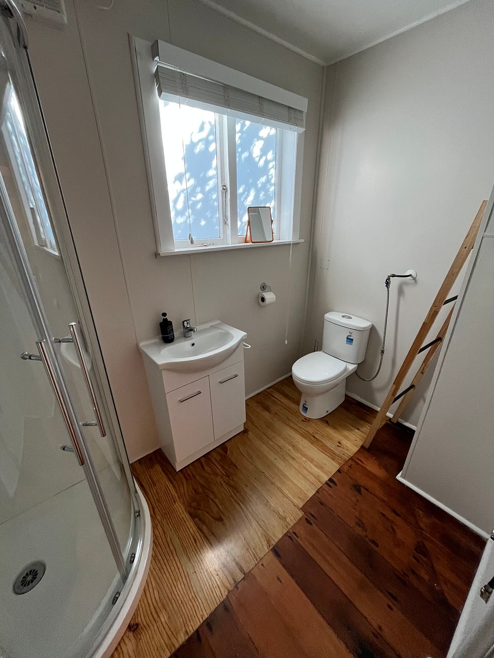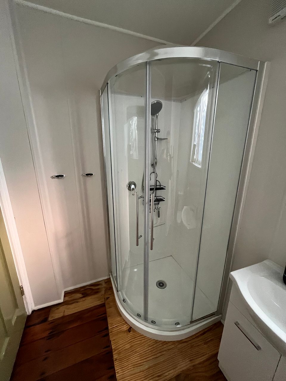 Bathroom: Spacious shower, vanity, and extractor fan; laundry area included