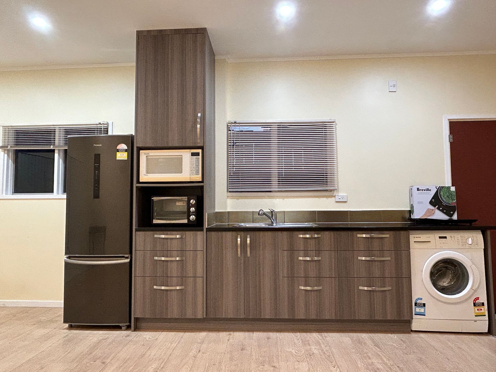 Included appliances: Near new fridge/freezer, portable cooktop for simple cooking, washing machine, small oven, microwave, gas heater and heat pump, hot water is on gas so you will not run out of hot water in winter!