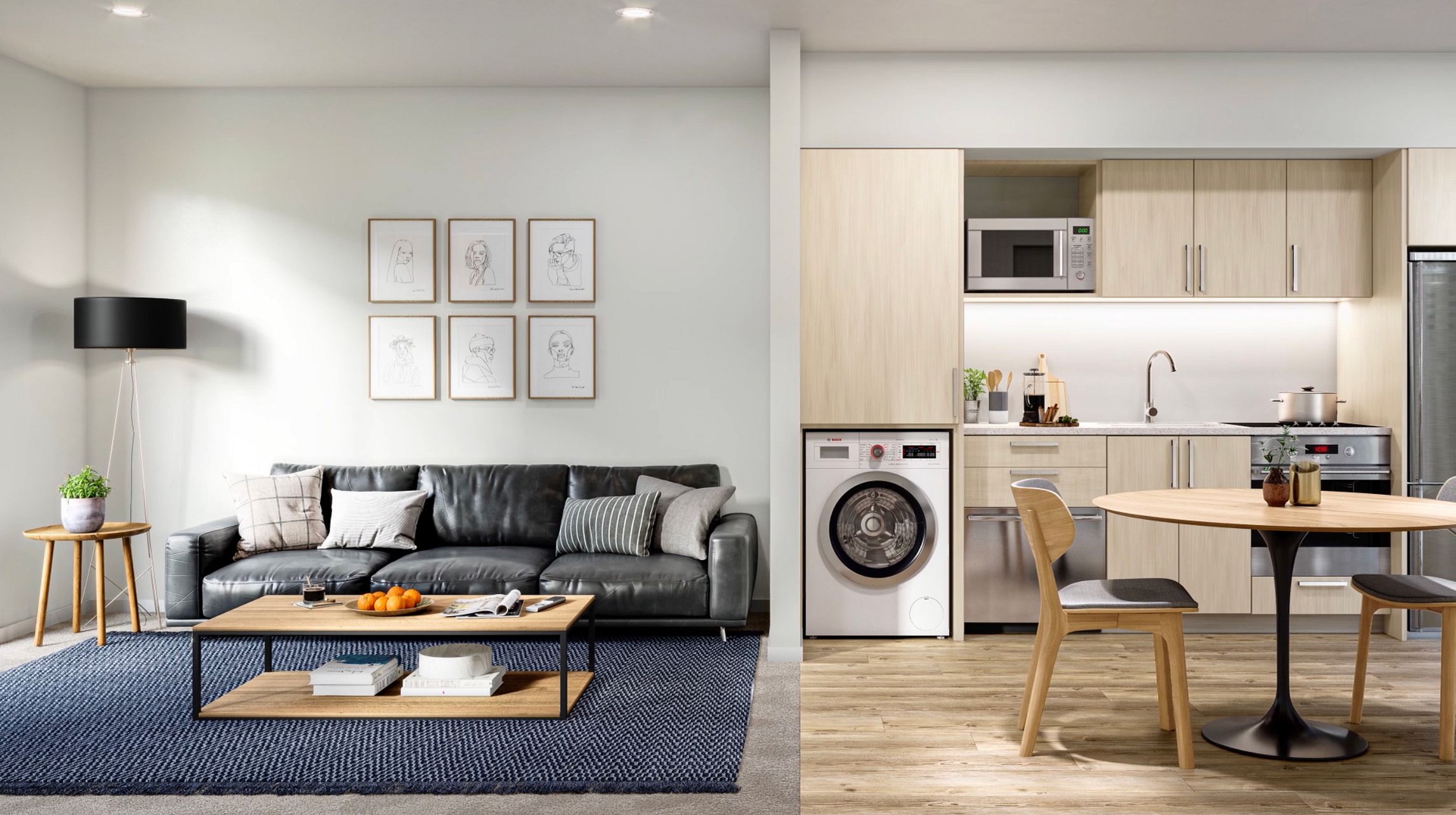 The ground floor features open plan living and an additional amenity bathroom (dishwasher, fridge and washing machine provided).