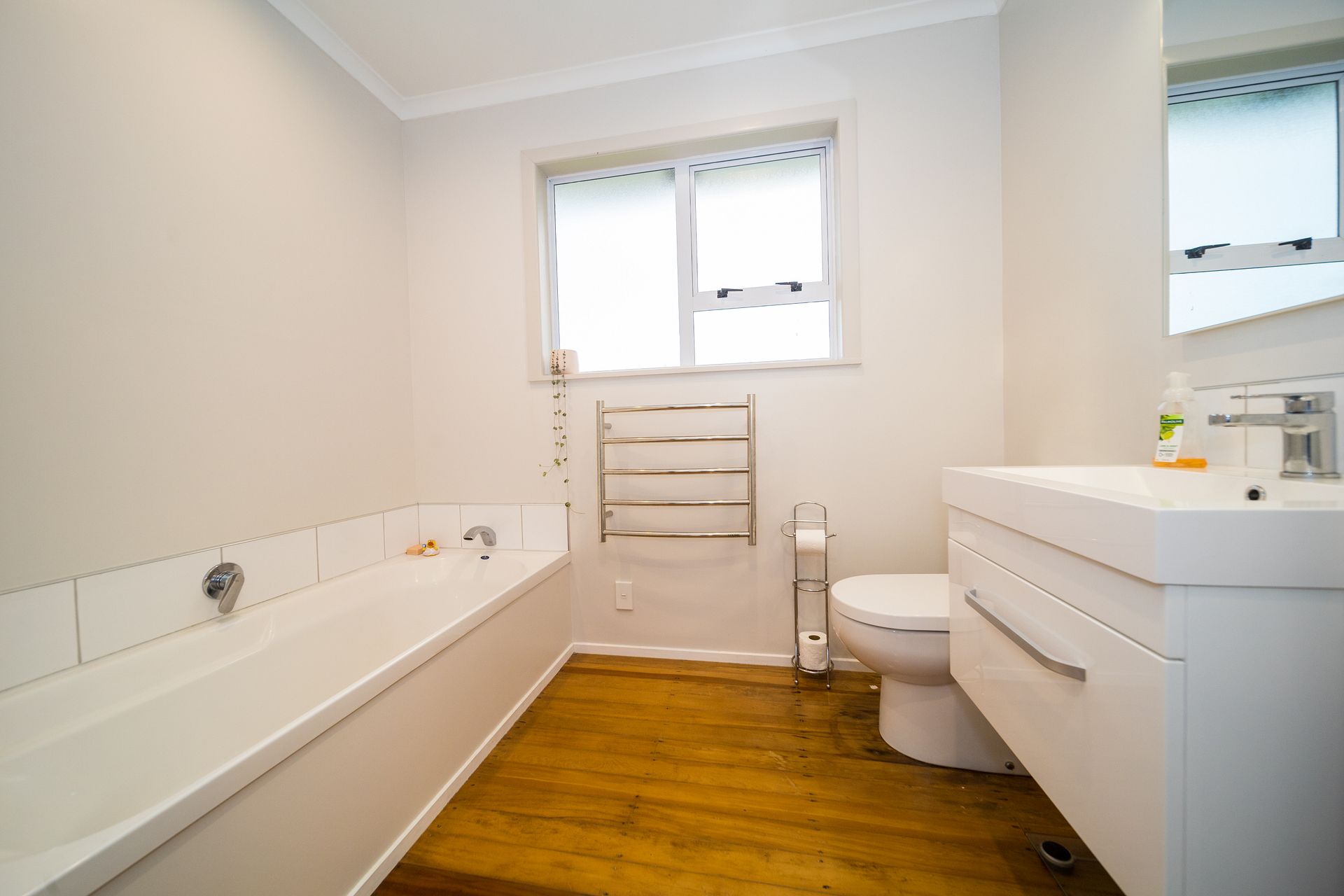 Bathroom with bath, shower, toilet and a separate toilet in laundry.