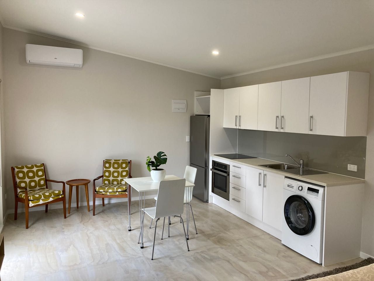 Studio Unit (combined living, kitchen/dining, and bedroom) with full kitchen (incl oven, ceramic cook top, rangehood, fridge/freezer and washing machine) seperate bathroom (with shower box, wash hand basin & cabinet, mirror, heated towel rail, toilet) and seperate built in wardrobe