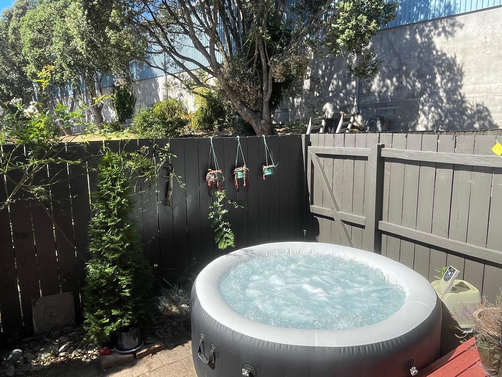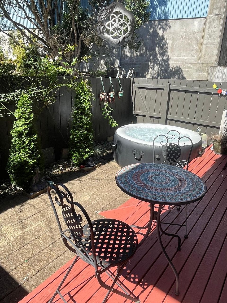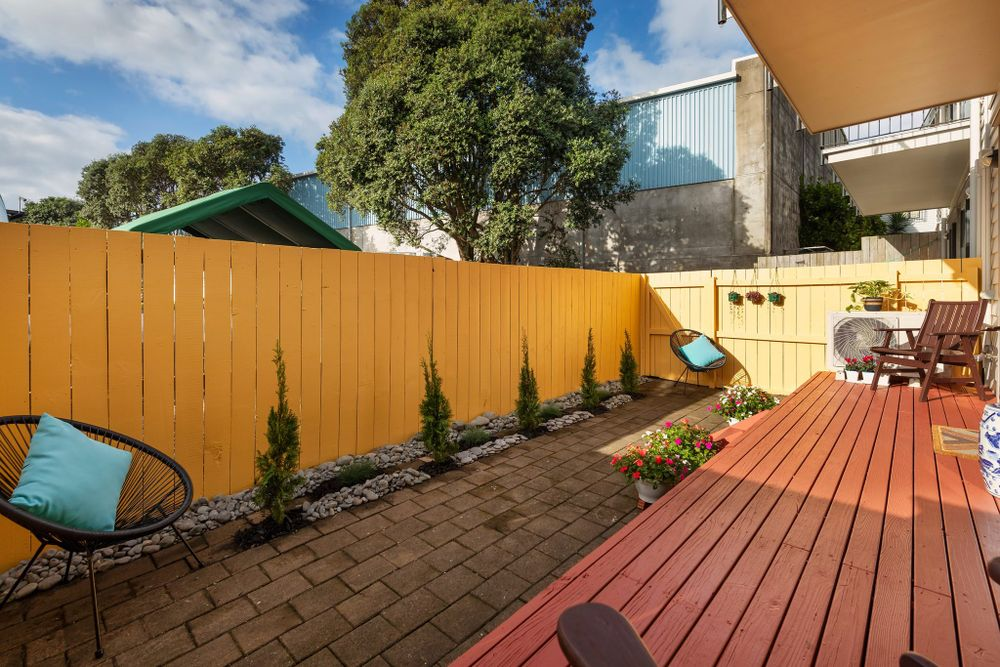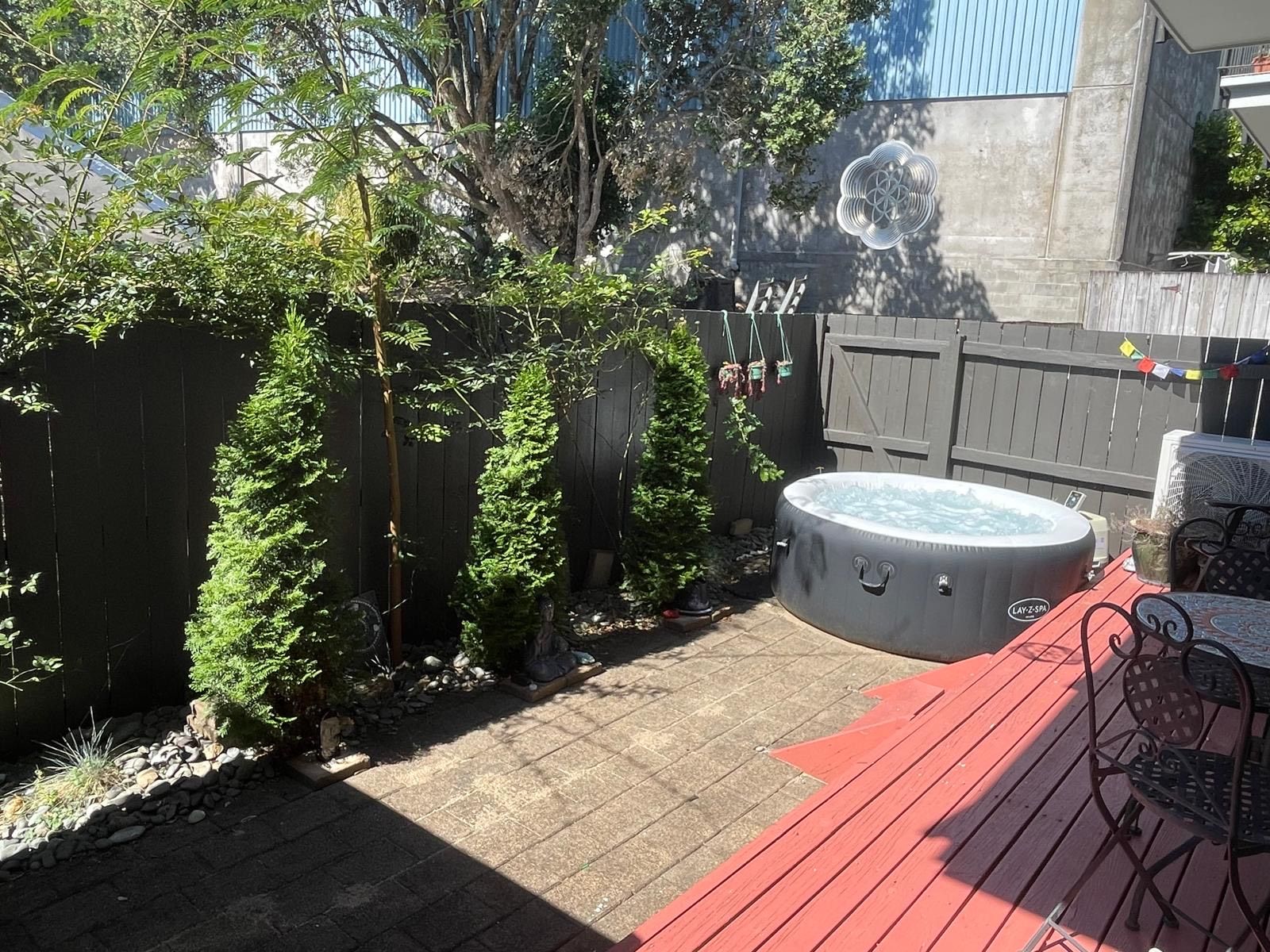 Spacious private outdoor area with a deck, paved courtyard, garden, and all-day sun