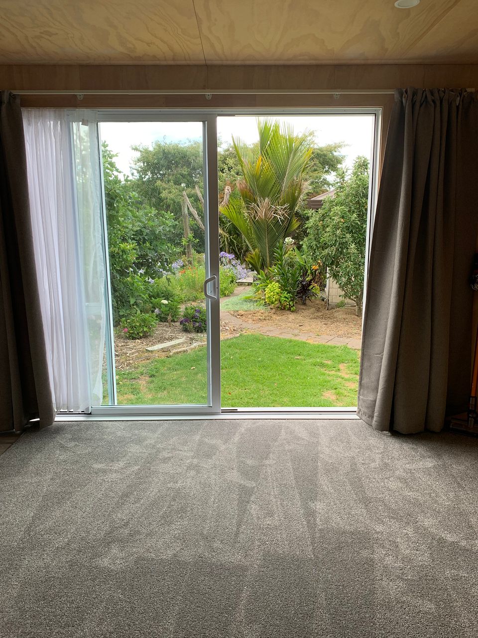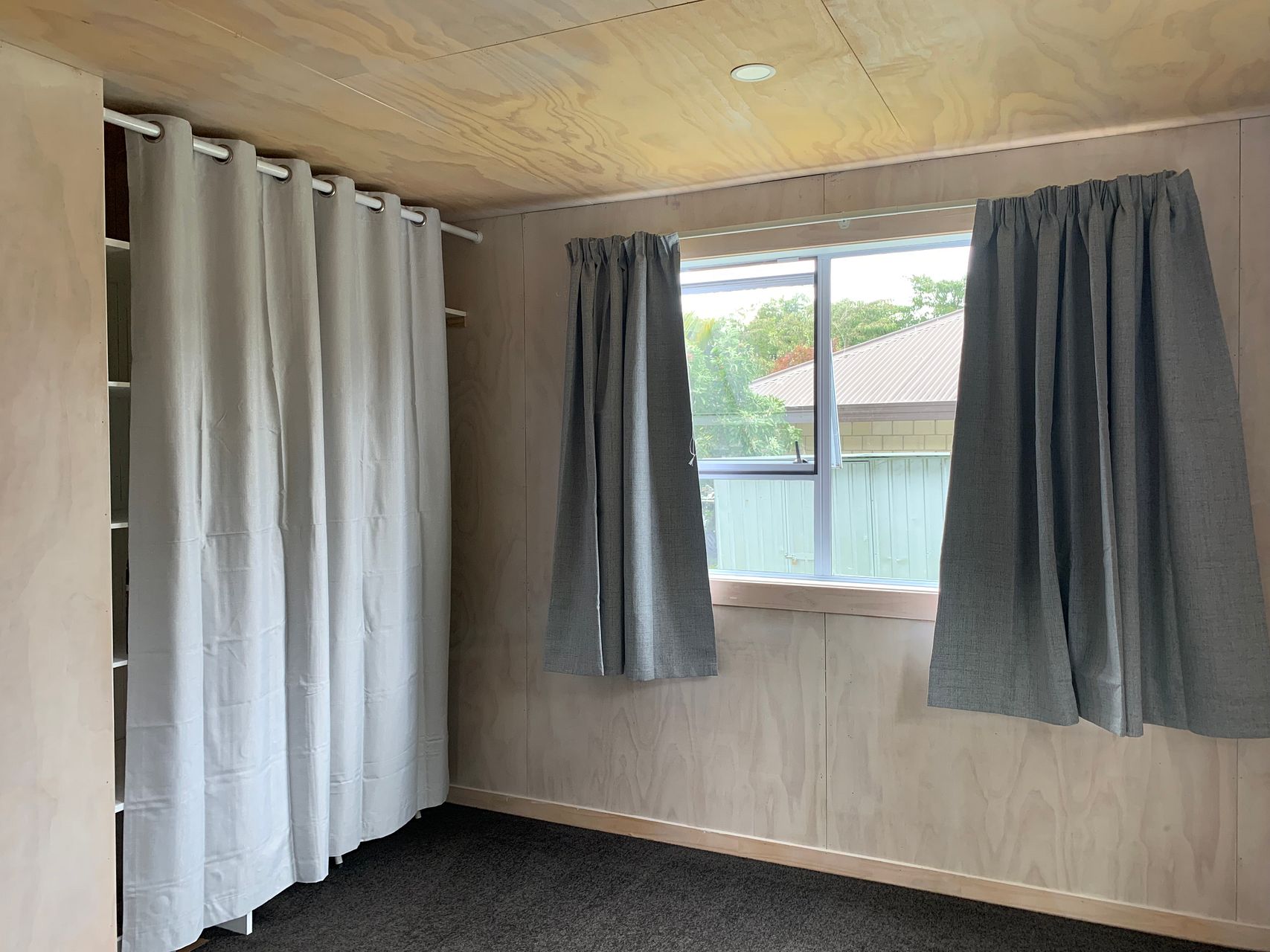 Stand alone building in our back yard, surrounded by trees and gardens