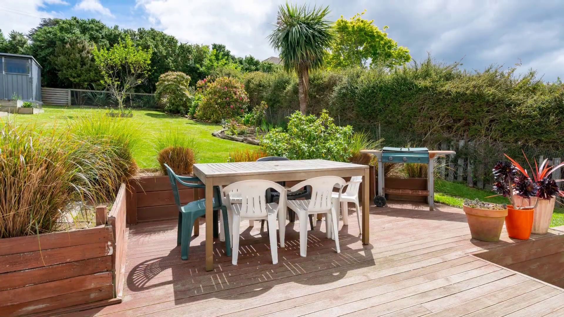 Big deck & landscaped backyard with raised veggie beds and a garden shed.