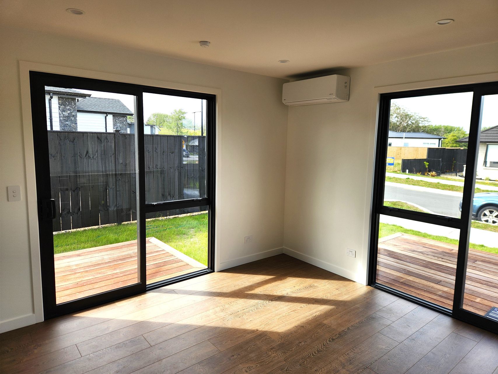 Sunny private garden with a deck and on-street parking available.