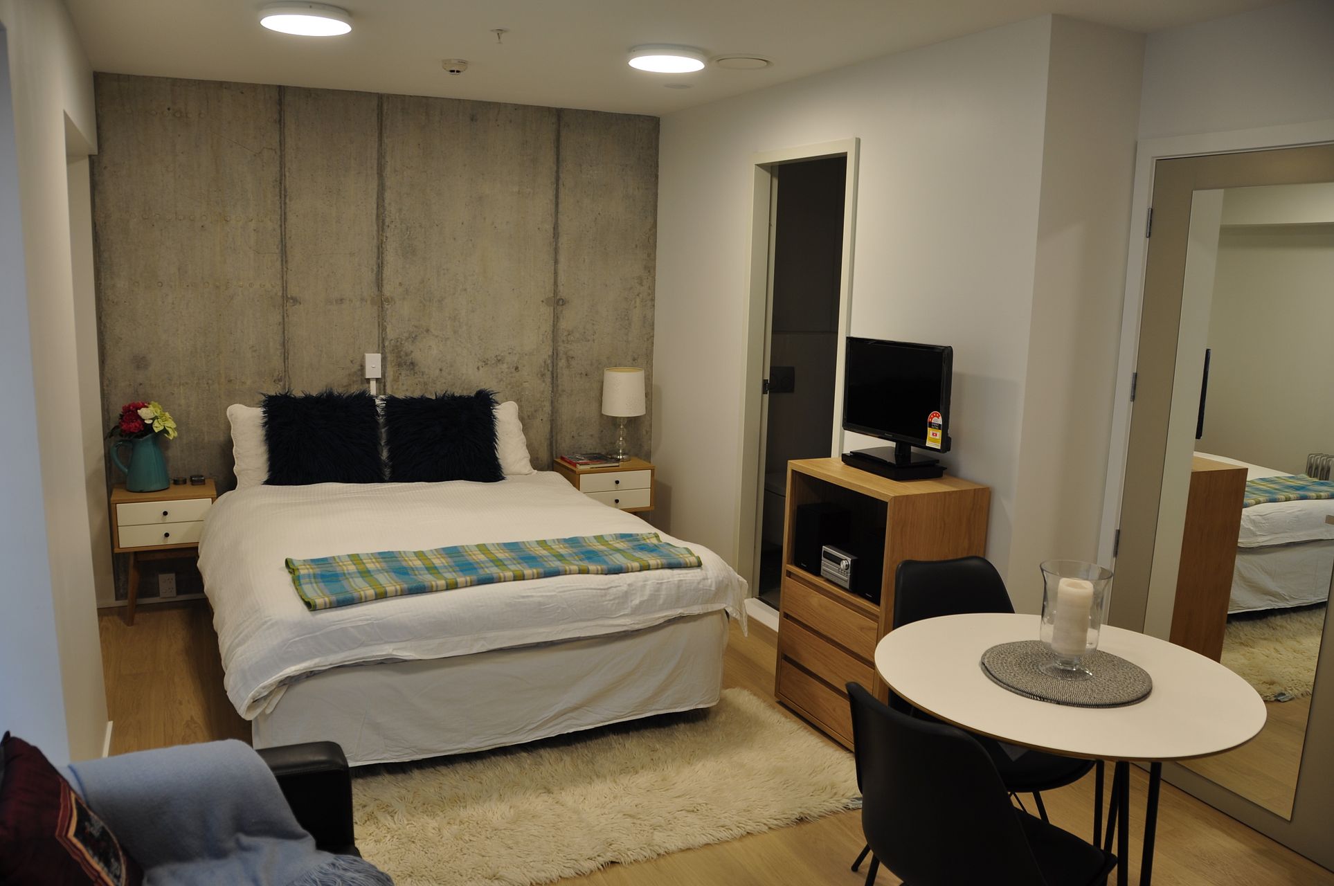 This is a modern furnished studio apartment with quality fixtures and fittings throughout. The apartment comes furnished with a queen bed, 3-piece dining suite, accompanied by a 2-seater couch. It also features a TV, DVD player and stereo system. The floor to ceiling windows provide lots of natural light while also being quite private with no buildings that have views into the unit.