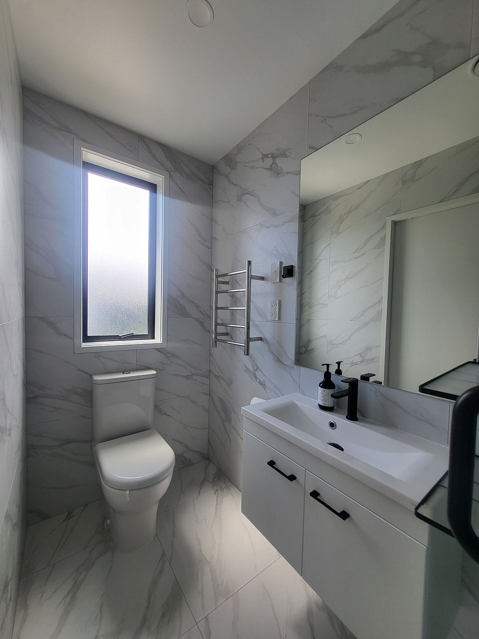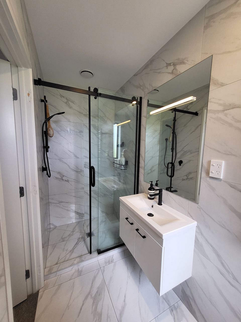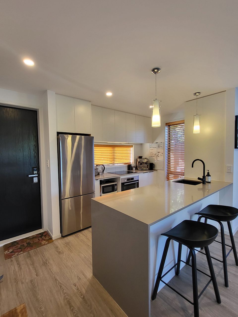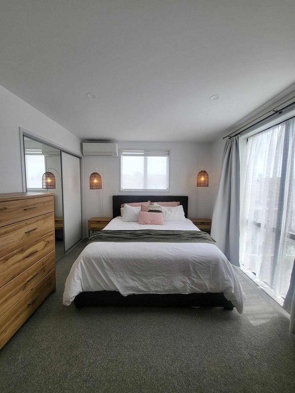 Upstairs has two queen bedrooms, a king master ensuite and family bathroom. All rooms include built in wardrobes with customisable shelving. Lots of natural light with floor to ceiling windows yet double glazing and heat pump/ air conditioning keep it the perfect sleeping environment.