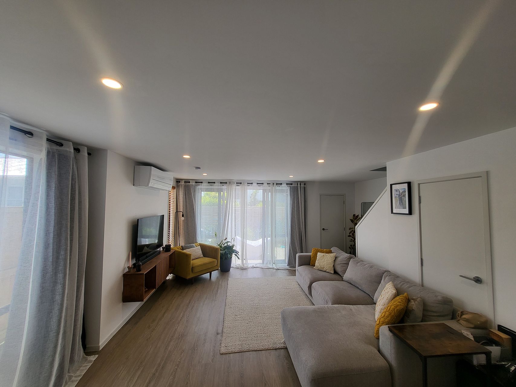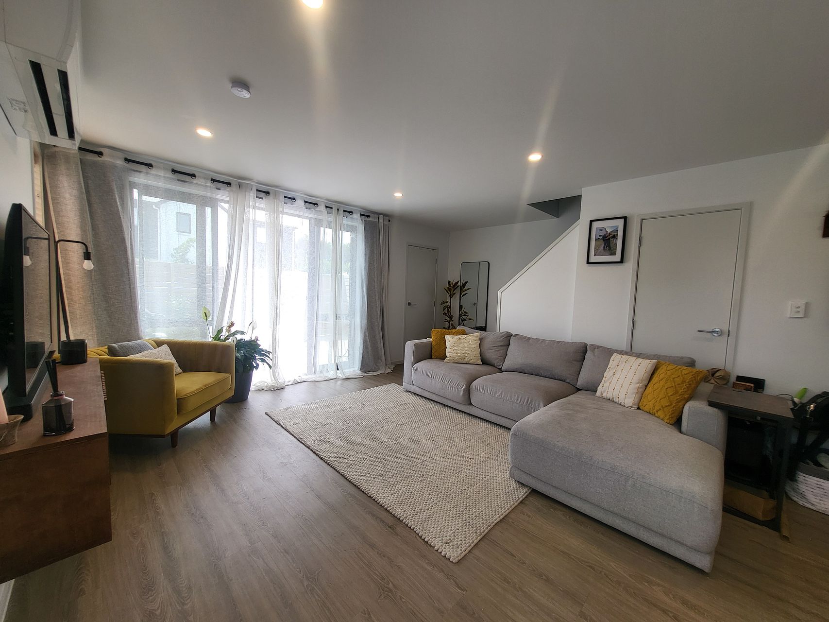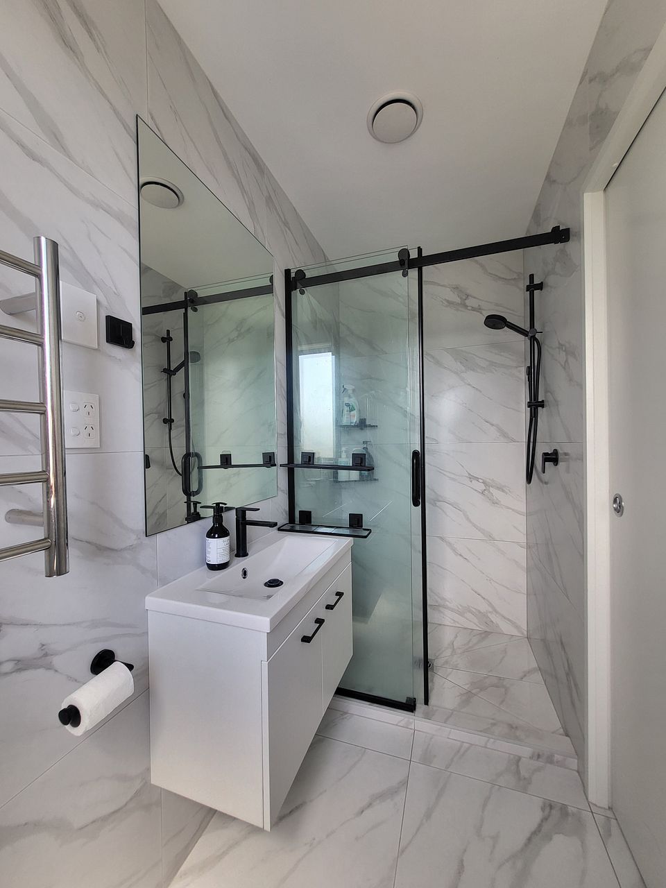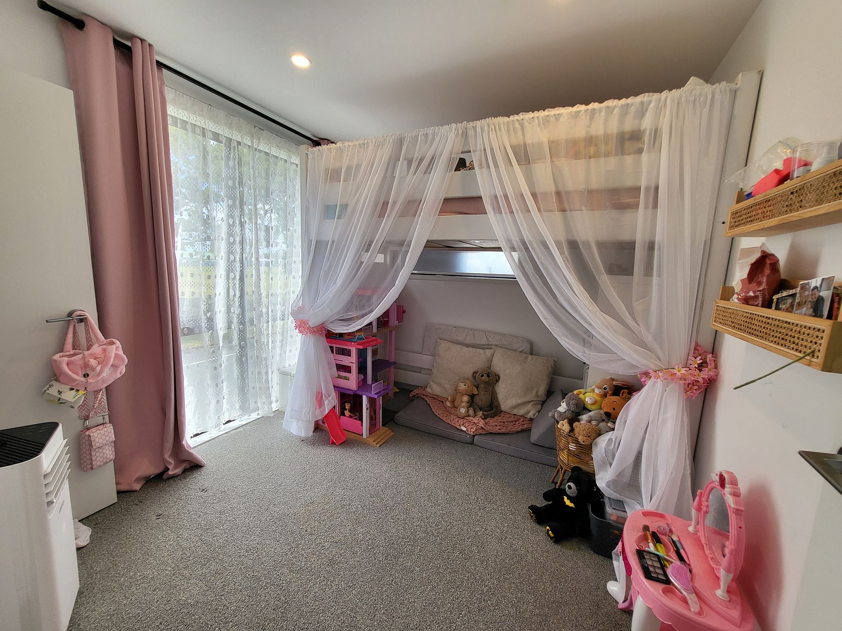 Upstairs has two queen bedrooms, a king master ensuite and family bathroom. All rooms include built in wardrobes with customisable shelving. Lots of natural light with floor to ceiling windows yet double glazing and heat pump/ air conditioning keep it the perfect sleeping environment.