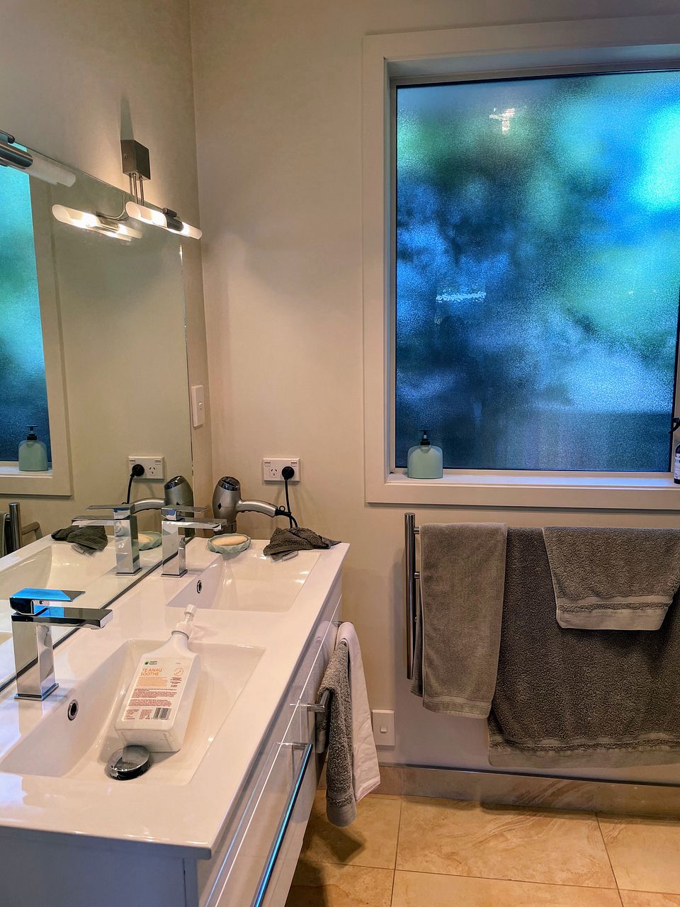 Modern tiled bathroom with heated towel rail