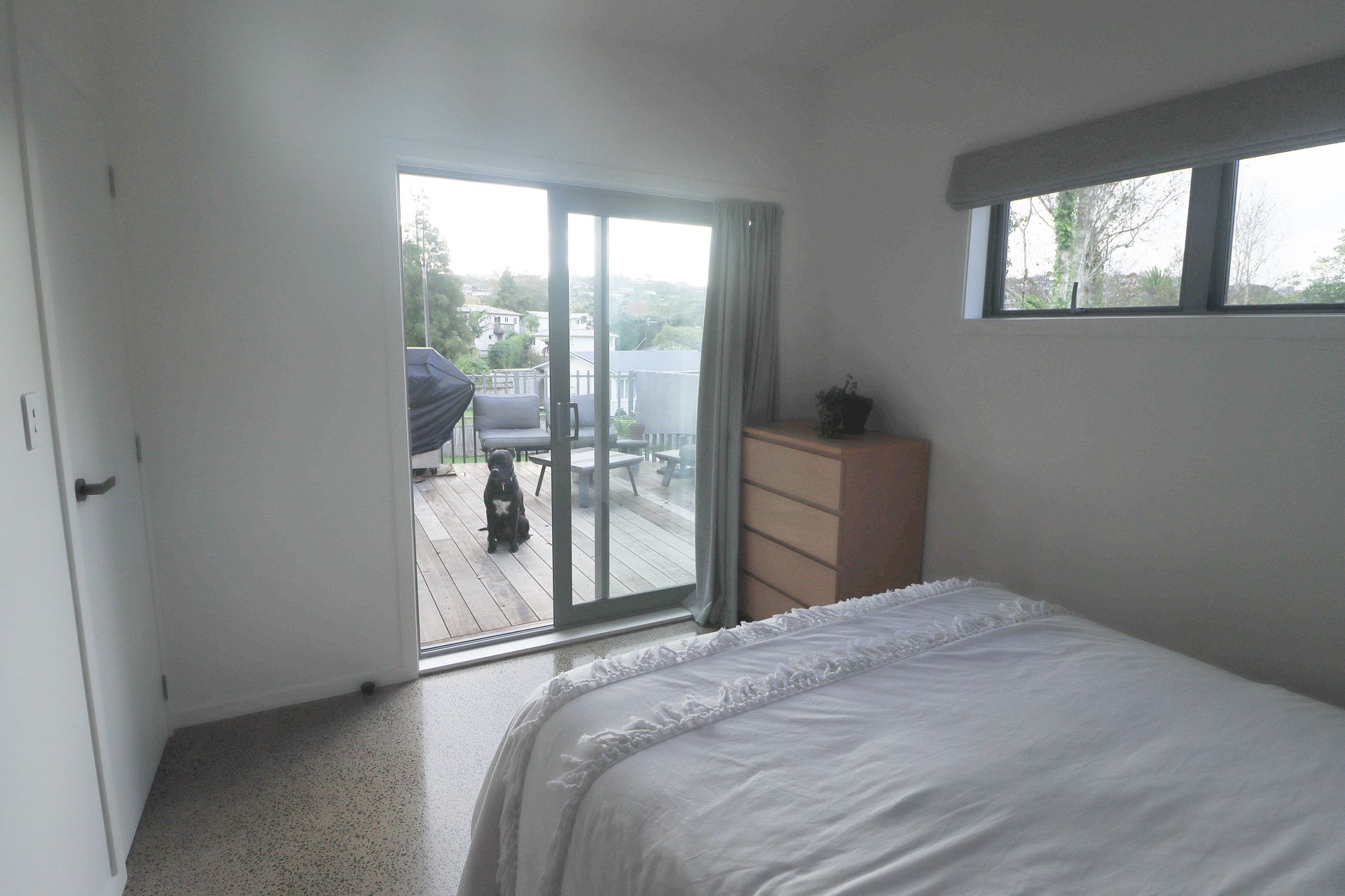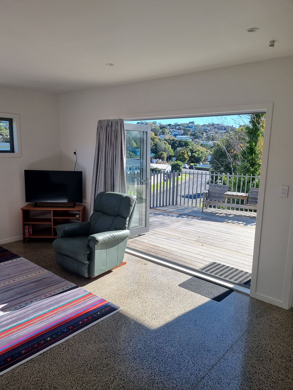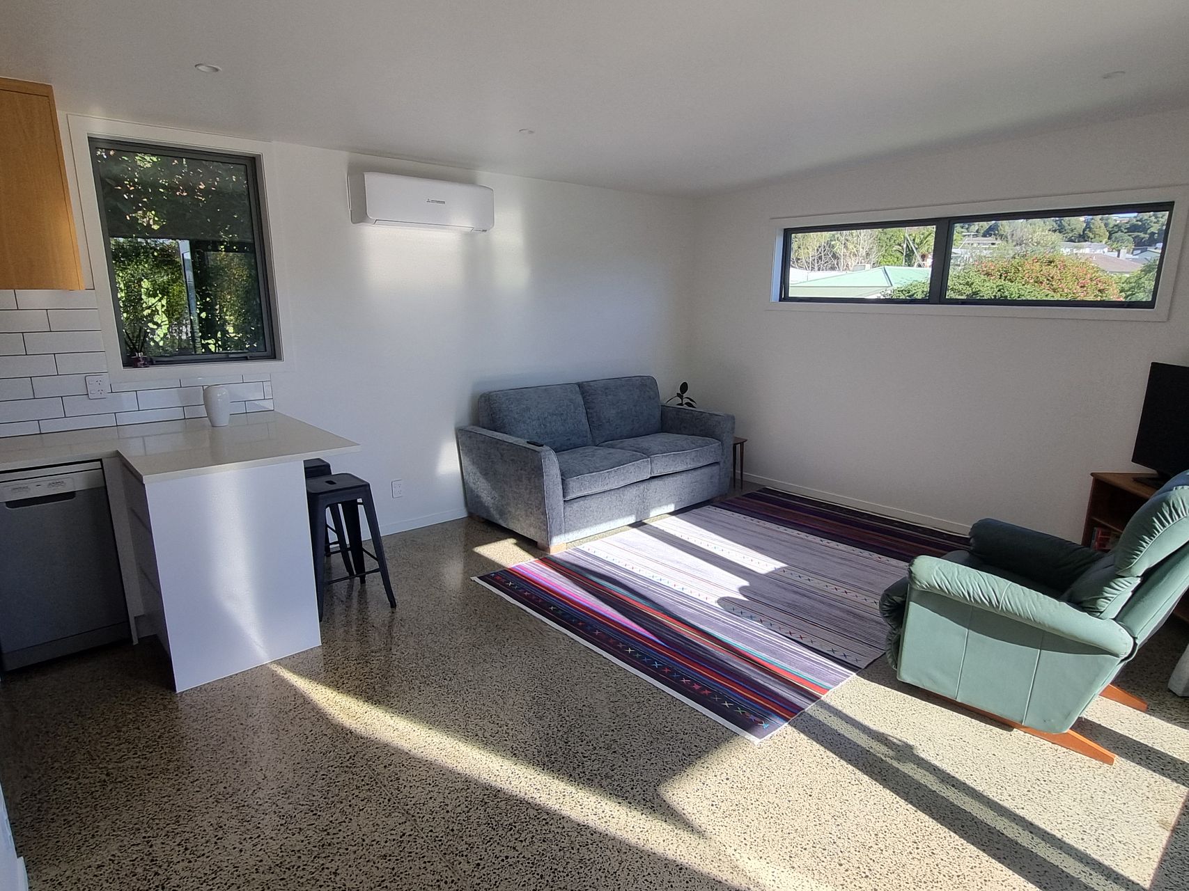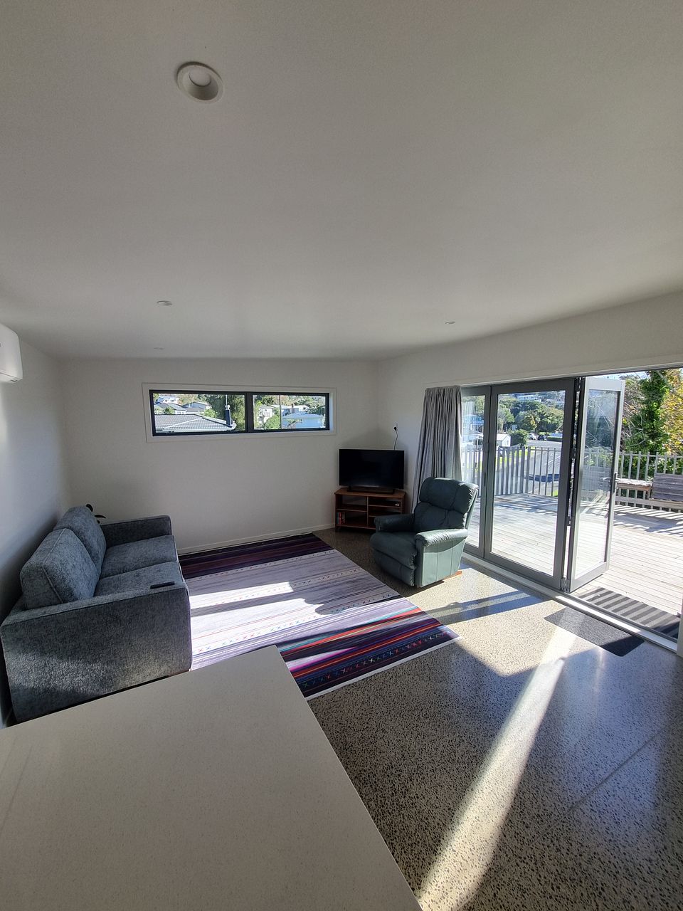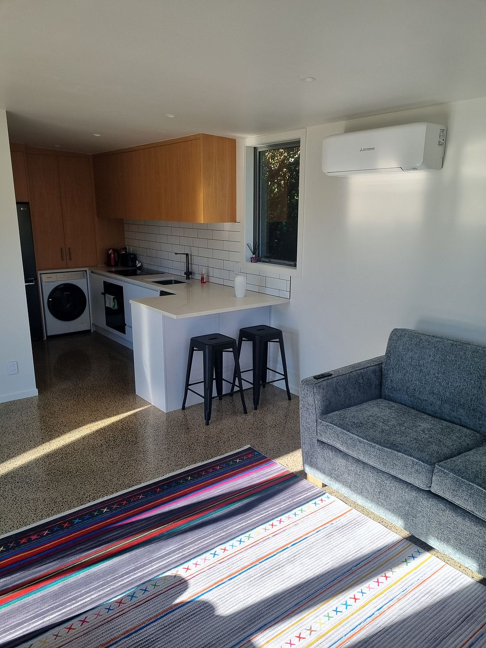 Our new build one bedroom home was built in 2023 and is a second dwelling on the front of our property. Sunny North facing deck, Polished concrete floors, designer kitchen and bathroom. The bedroom has a generous wardrobe, double gazing and heat pump.
