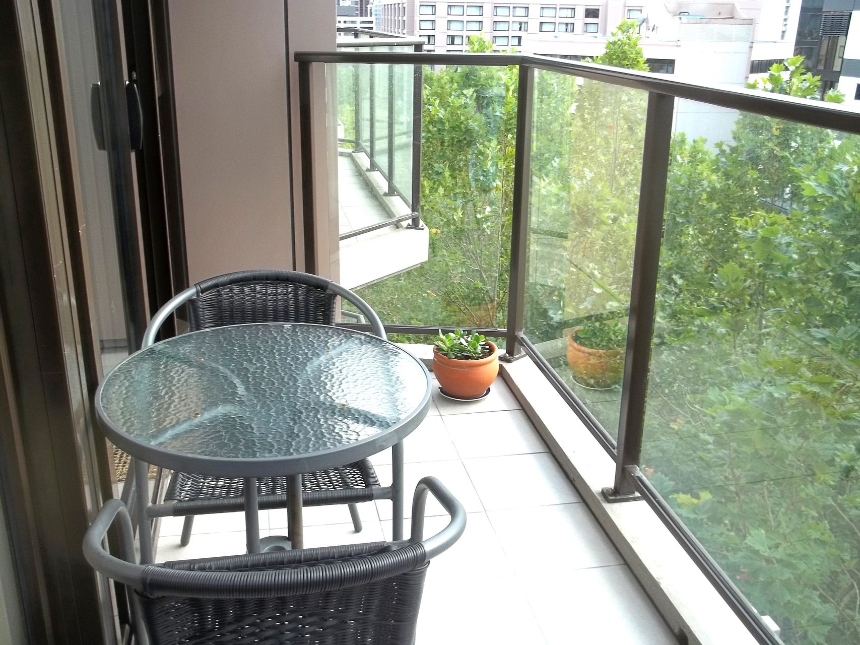 Large balcony overlooking tree lined street.