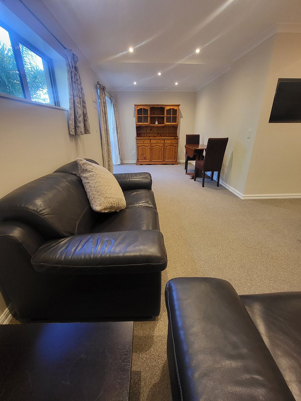 Flat comprises of 2 bedrooms, main room with en-suite and walk in wardrobe. Other single room with built in wardrobe. Living area with heat pump and kitchenette with walk in pantry. All windows are double glazed.