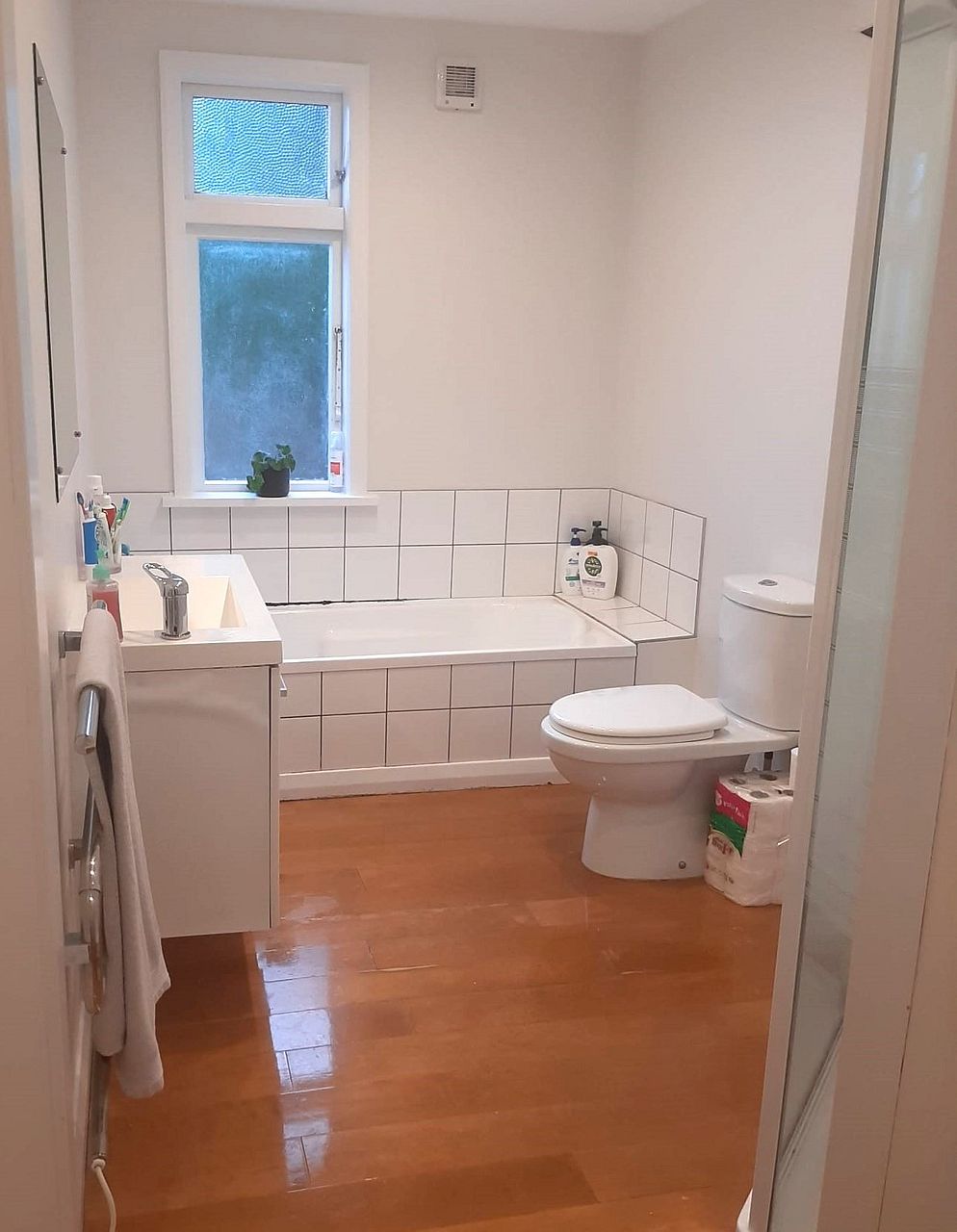 The bathroom has a shower, bath and toilet. There is also a separate second toilet with hand basin.