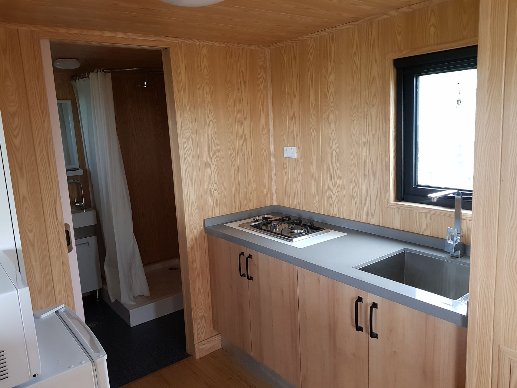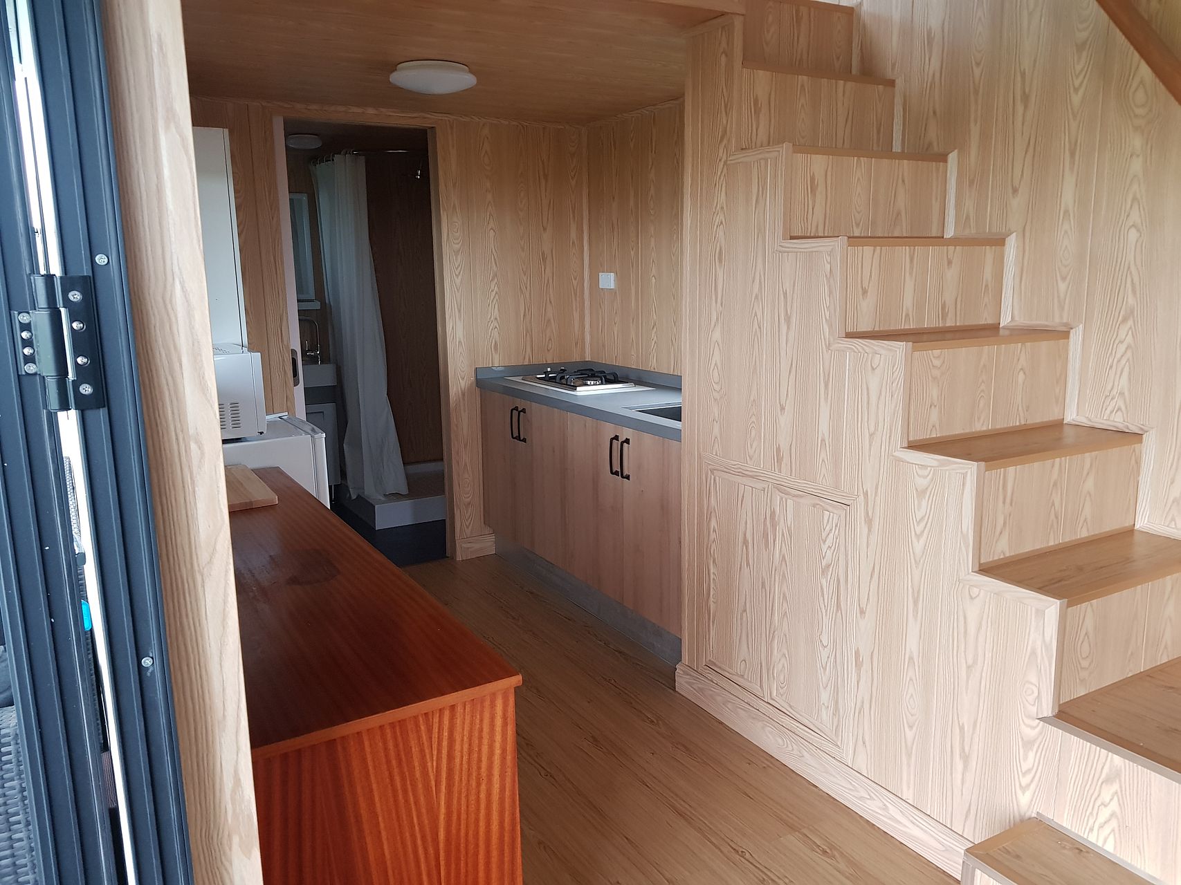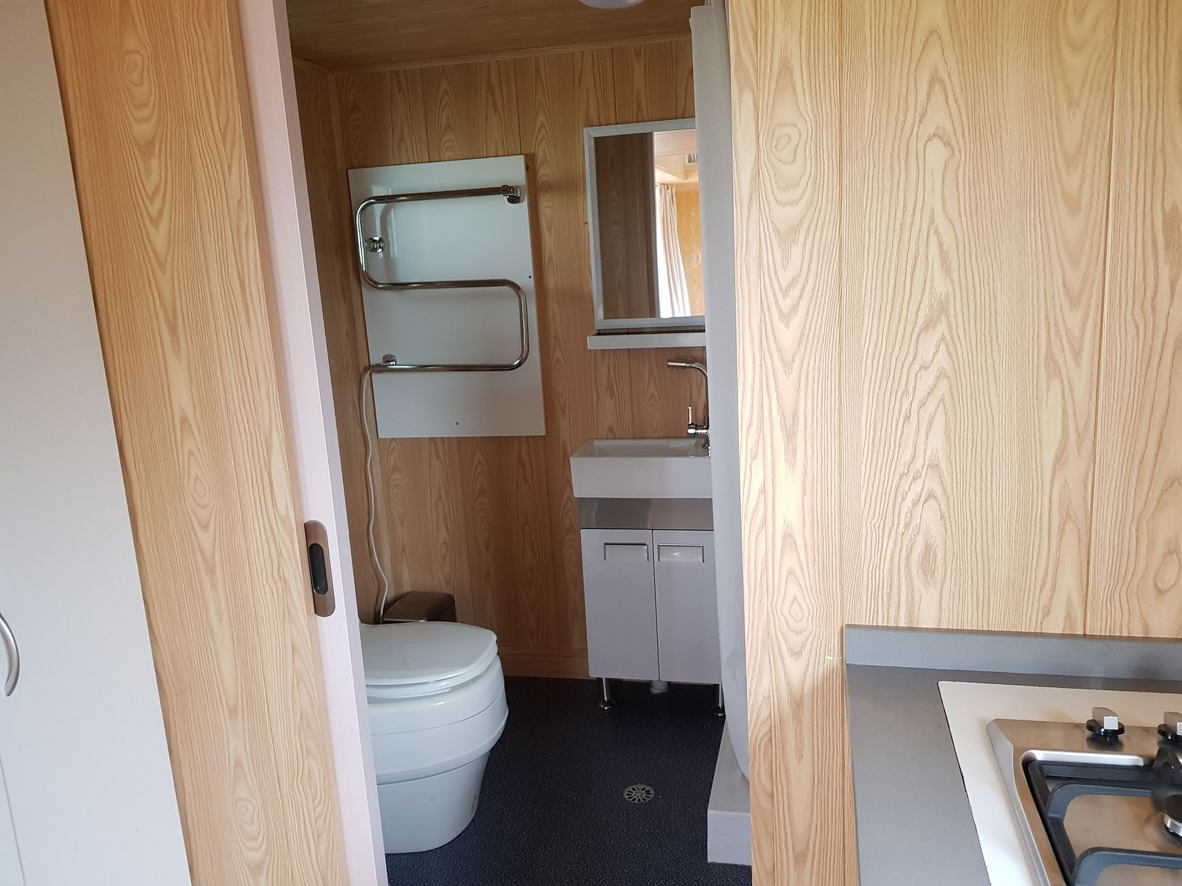 Bathroom: Has a shower, vanity, heated towel rail and composting toilet