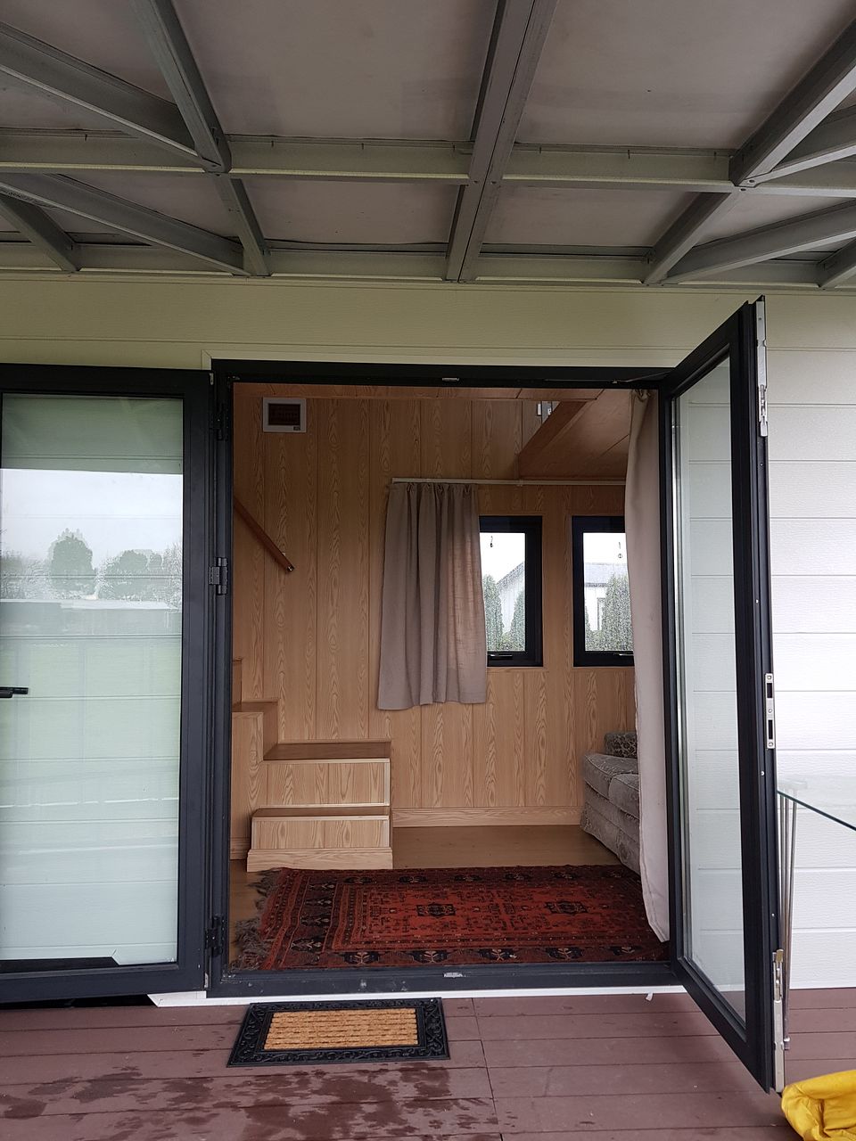 Outside: large deck with a large table and chairs, a garden and paths (still in progress) that we will look after. No lawns ;-)