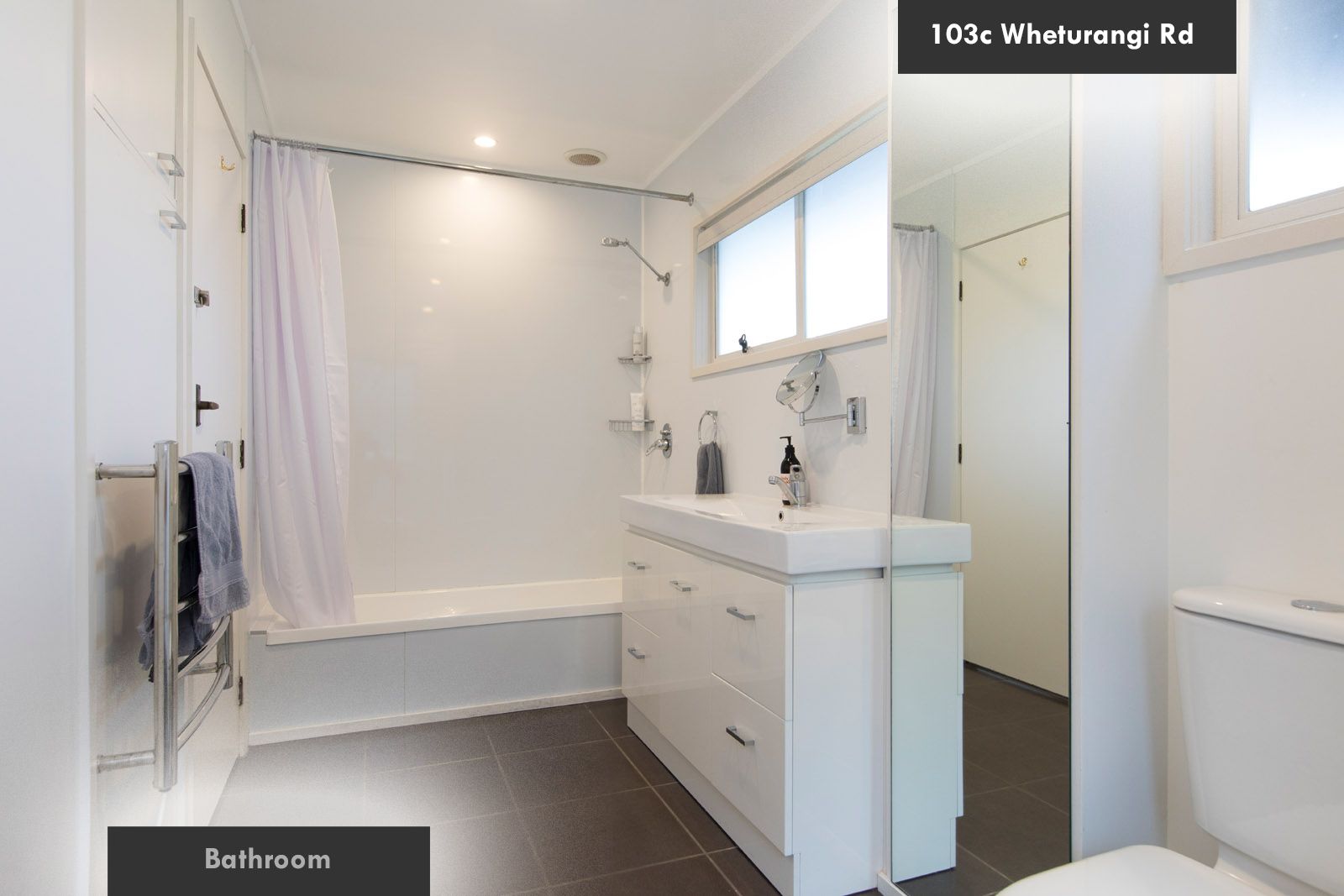 Bathroom has shower over bath, vanity with storage and mirror, linen cupboard and washing machine and dryer.