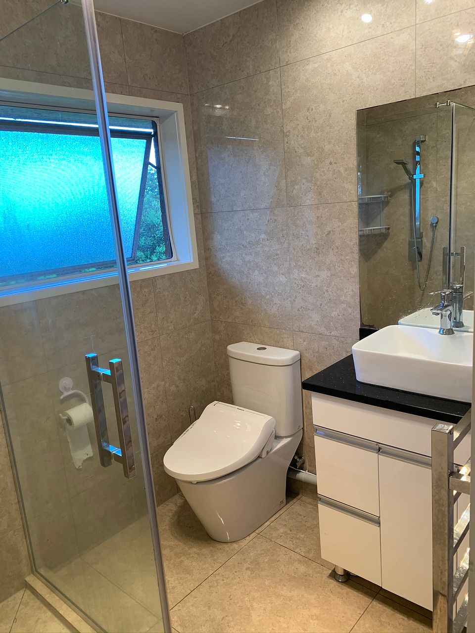 It has two air conditions, and it has a nice kitchen with beautiful stone benchtops, Glass shower box, and a wooden floor. Dishwasher, waste disposal, nearly new functional OVEN, and lots.