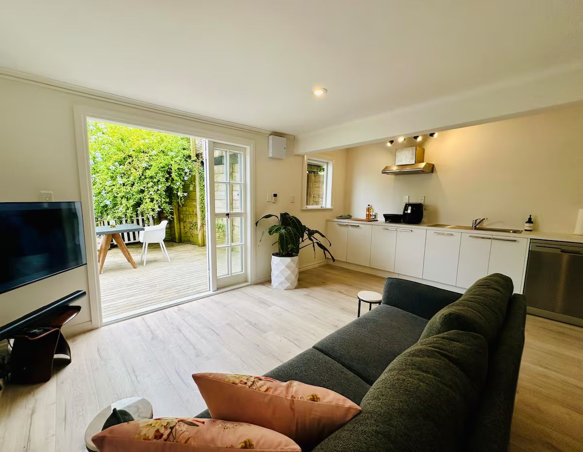Right bang in the middle of your three favourite Ponsonby & Grey Lynn Countdowns, and just a 20min walk to the city, the location of this 2 bedroom downstairs flat is everything you’d want. Large deck looks out onto a green view from the living room, that makes it a really happy place. There are legit tui, piwakawaka, and all sorts of other birdsong around. It’s a great community, you’ll definitely be making pals with the folk around here. It’s a rare find, to be so close to the city but feel like it’s green belt. Perfect for a couple or single. Pets considered.