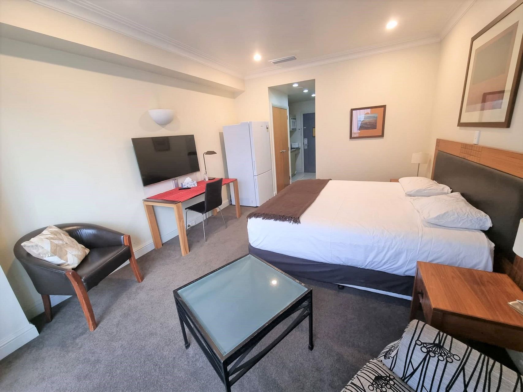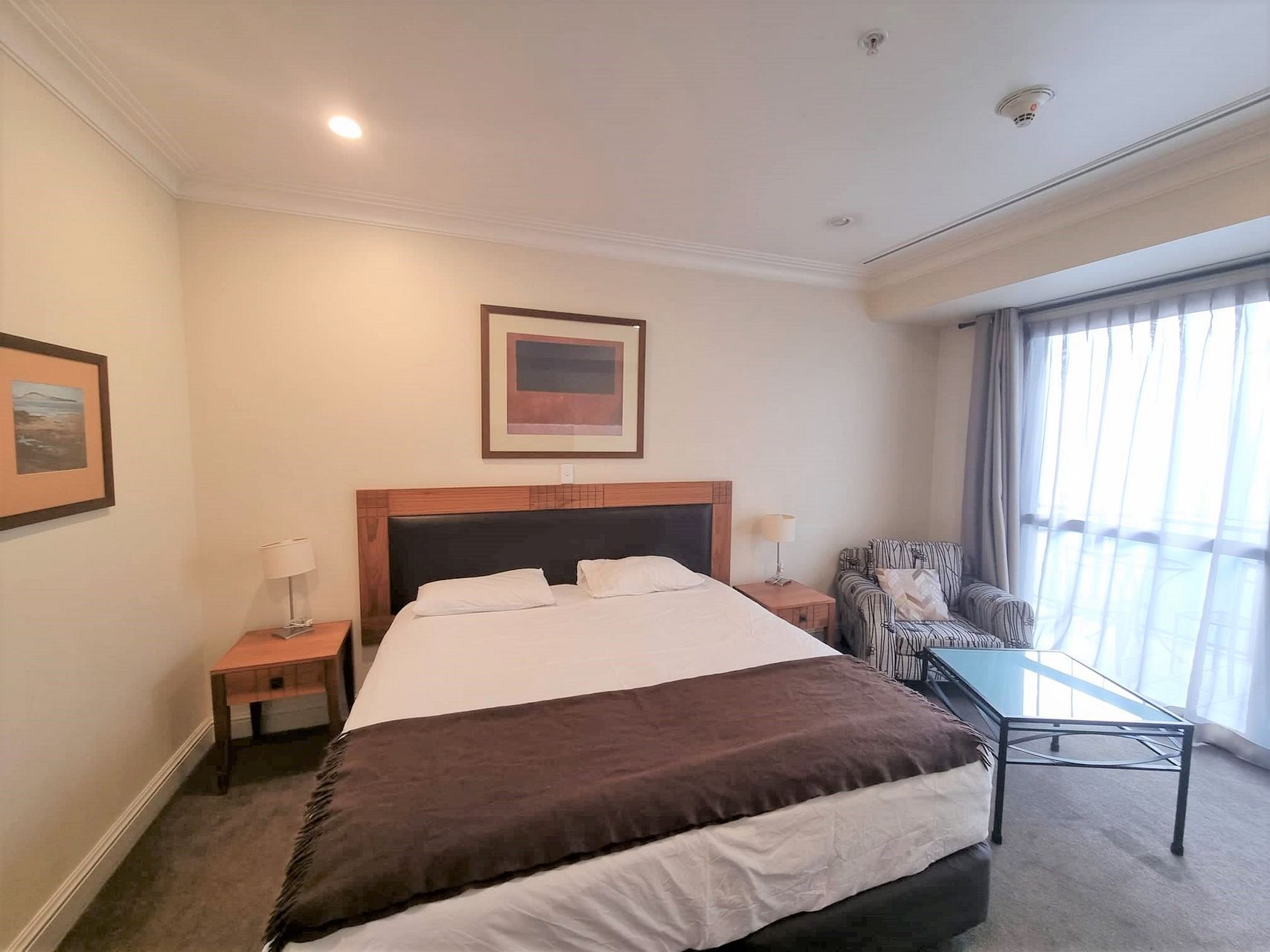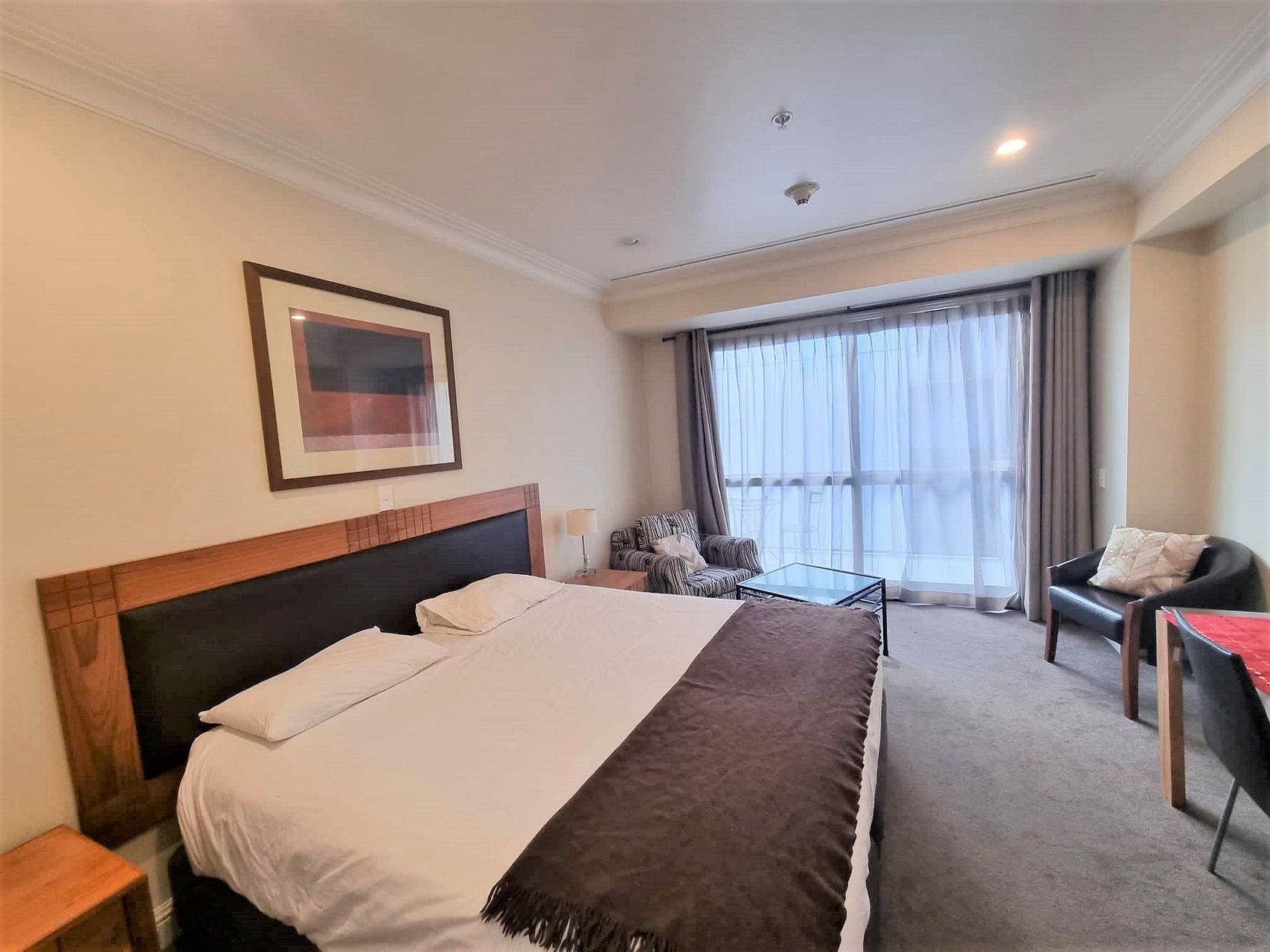 Spacious fully furnished studio apartment apartment with balcony looking towards the Sky Tower.
