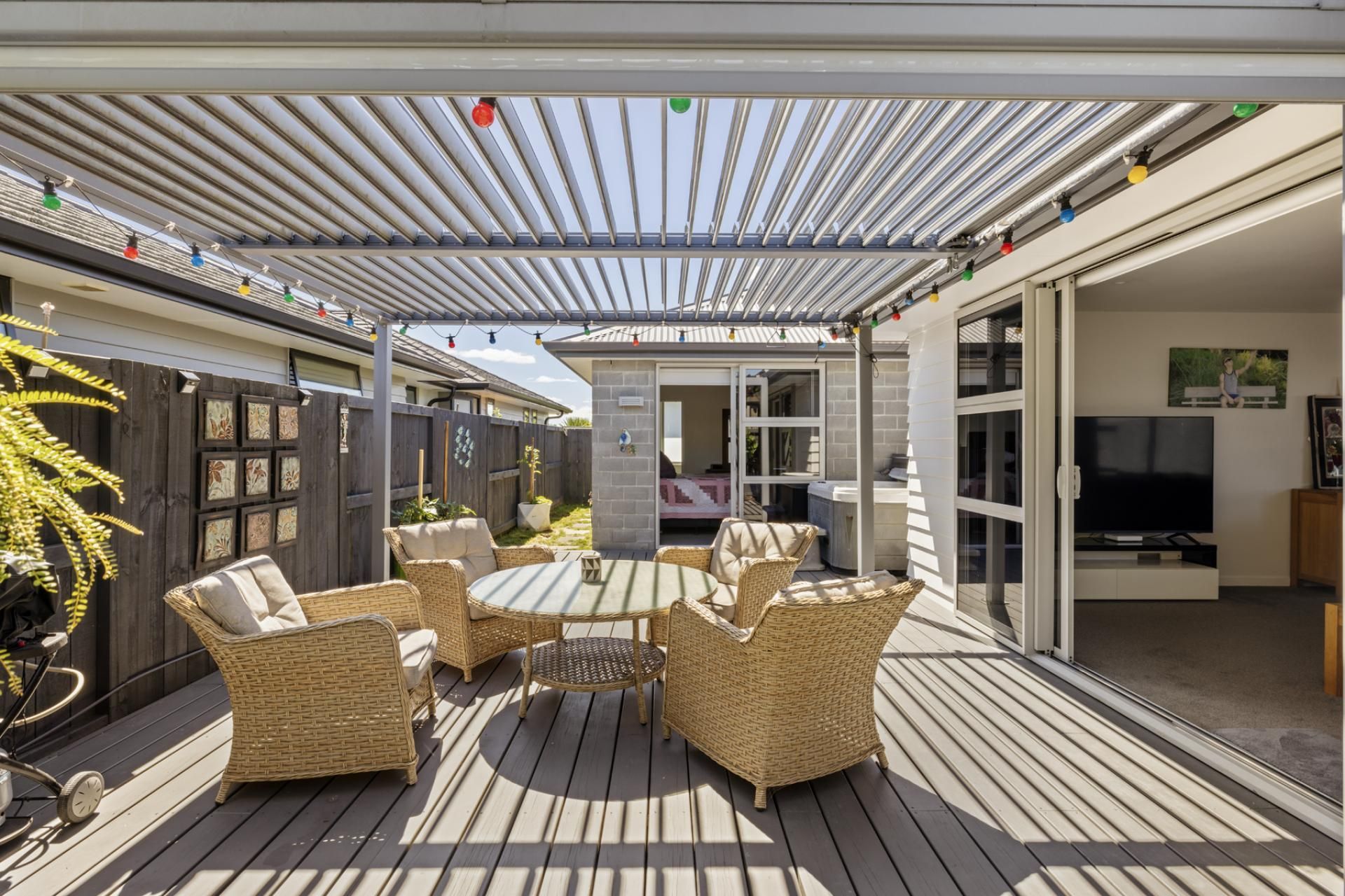 A large outdoor living area with louvure roofing system is a delight with a fully-fenced courtyard and an inviting deck that is perfect for entertaining.