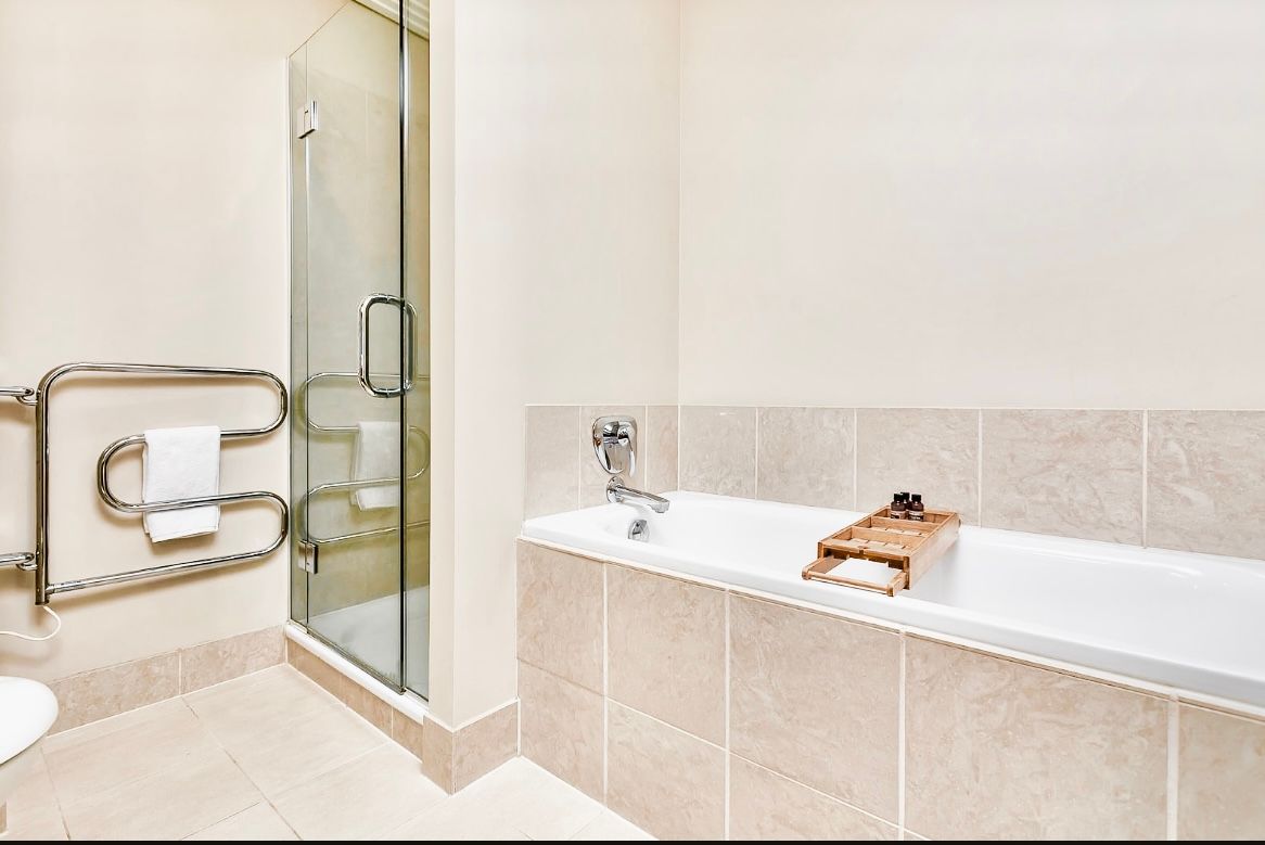 Build-in wardrobe, heated toilet rail, hair dryer, bath tub , privacy window seal