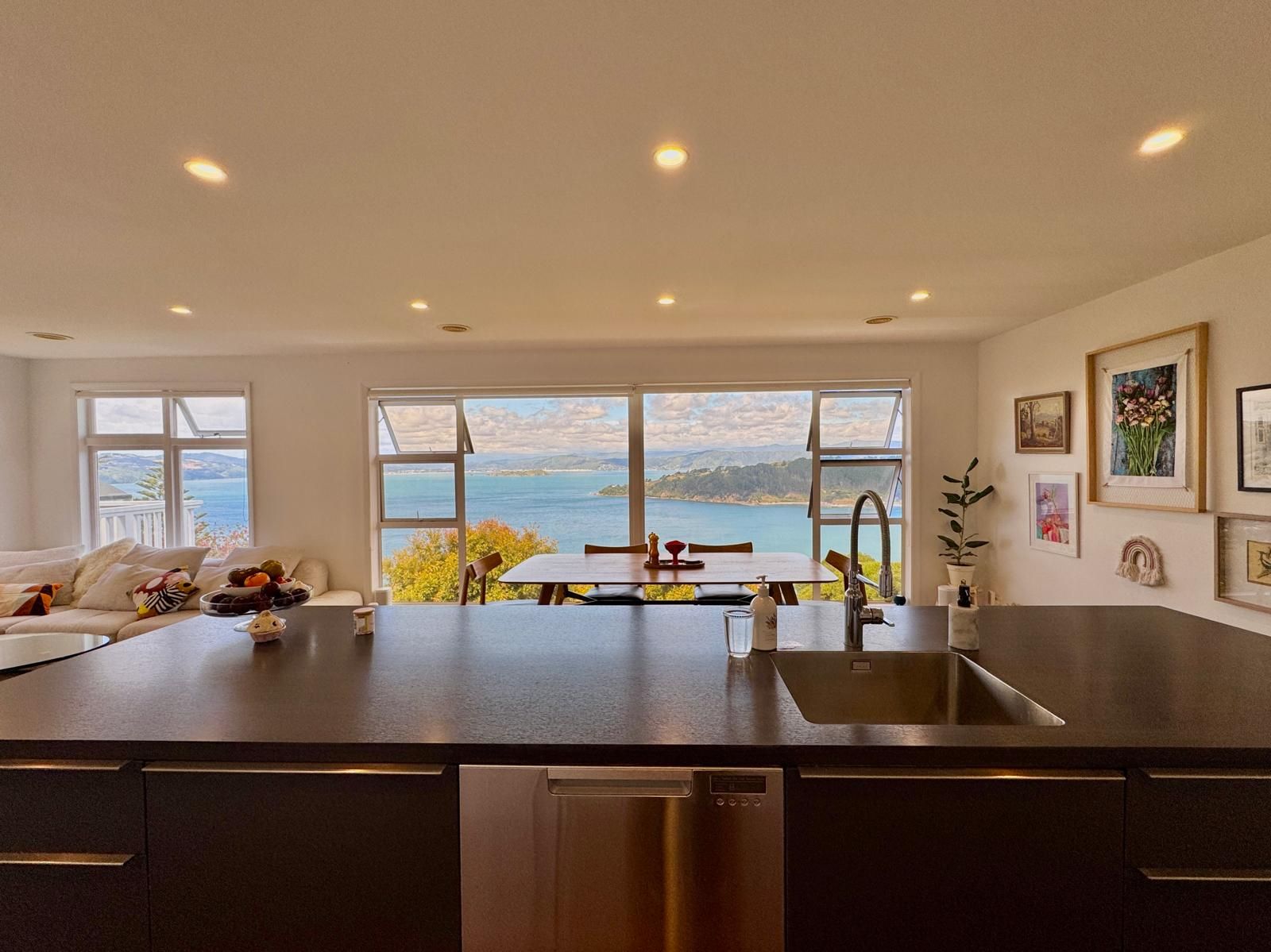 * Modern kitchen/dining/living, French doors to sunny deck, sea/mountain views