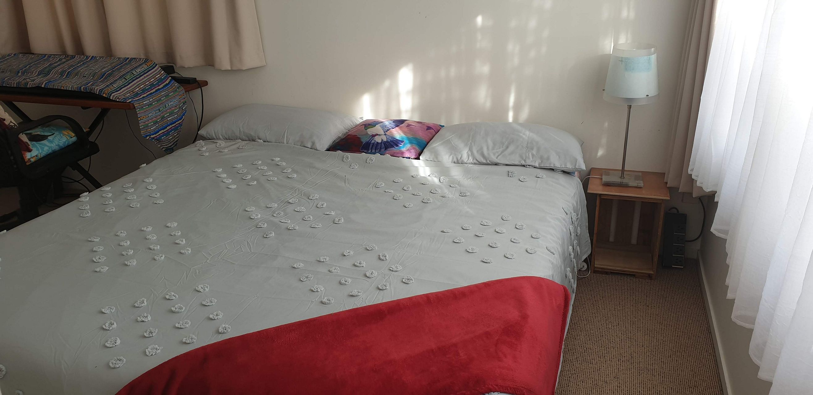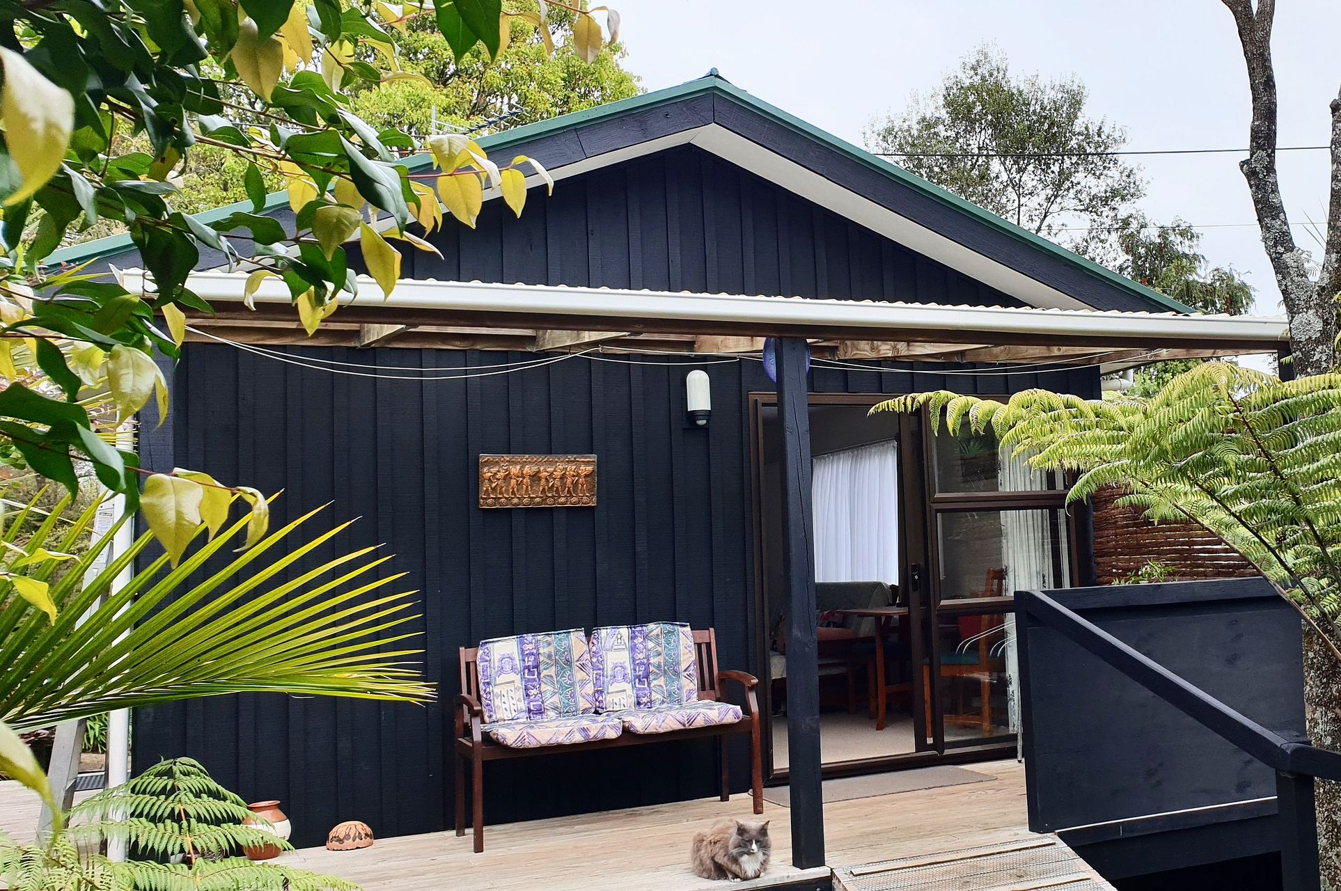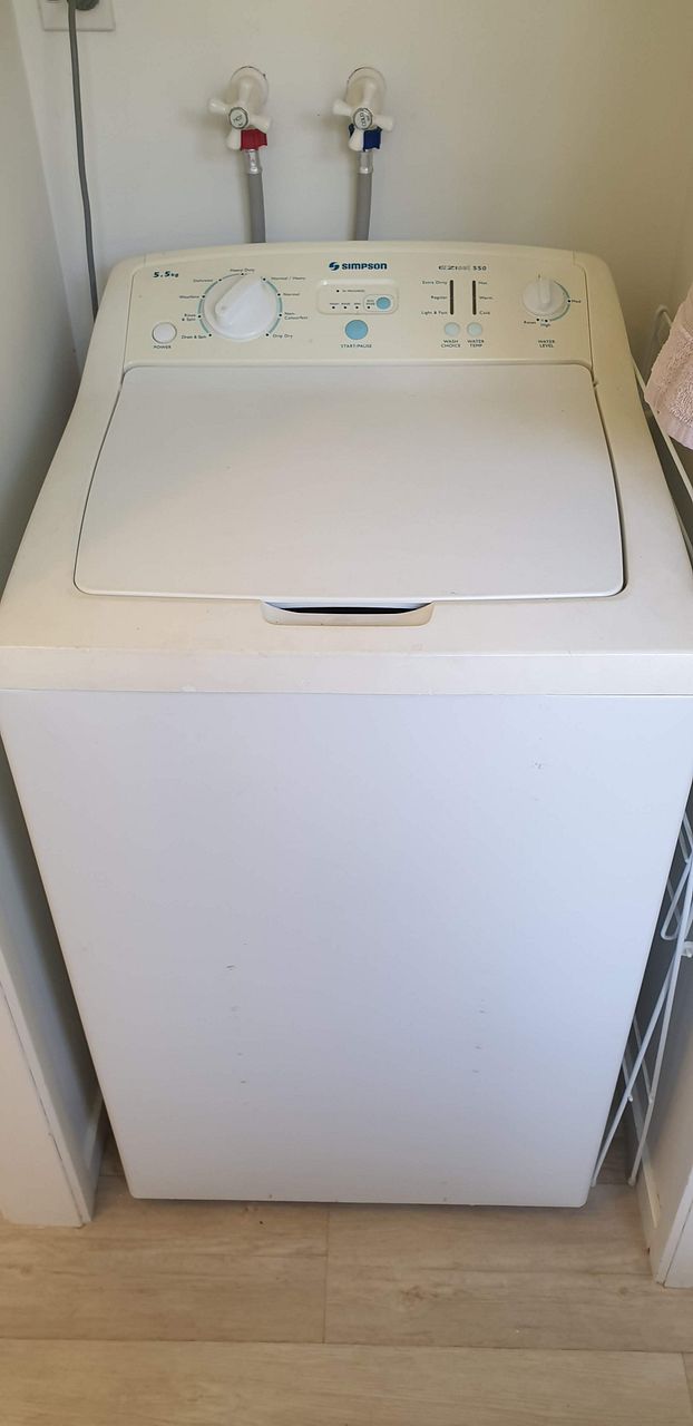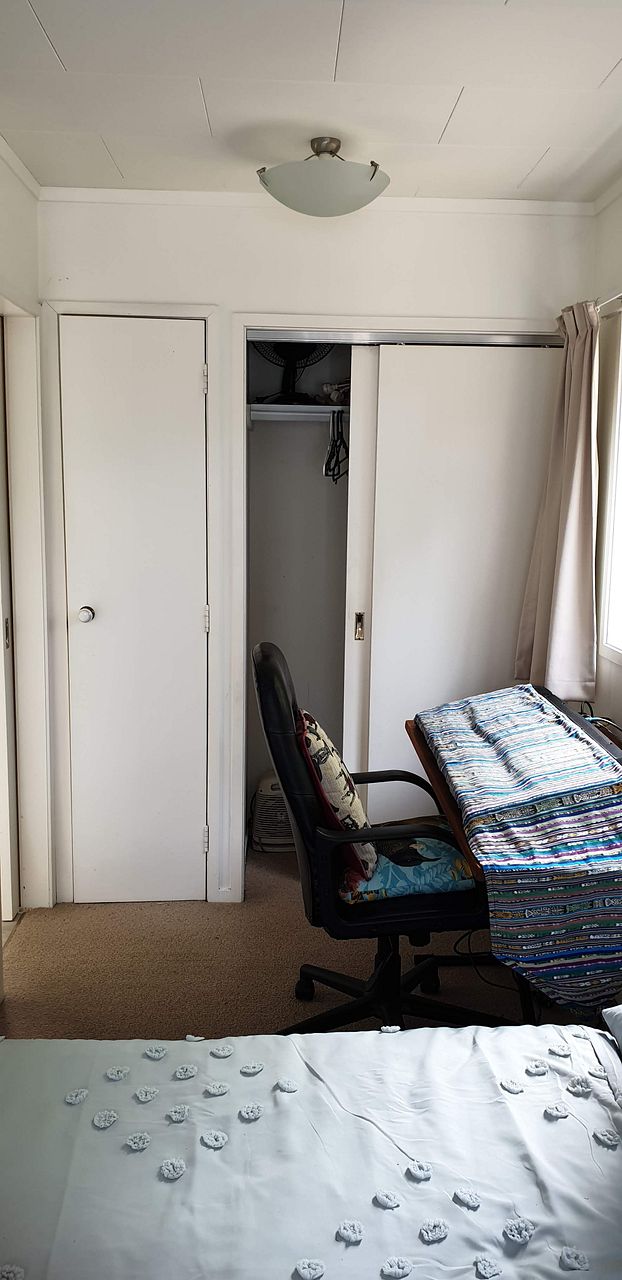 Full kitchen with electric oven (but no dishwasher). Bathroom with shower and decent sized vanity, plus washing machine. Separate toilet. Larger than normal bedroom that fits a super king bed and a desk. Bedroom has built in wardrobe. Hot water cupboard, outside clothes line under covered deck. Near new efficient heat pump/air conditioner.