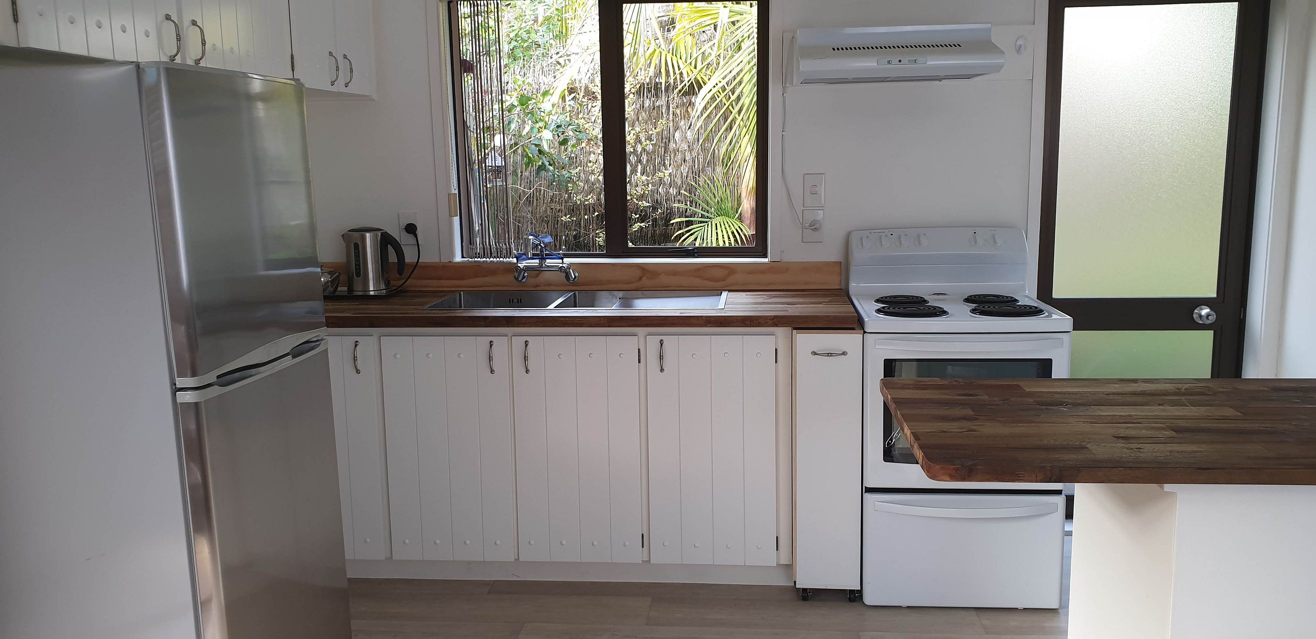 The cottage has just been repainted outside and had new vinyl installed in kitchen/bathroom, with kitchen cabinets repainted. New wooden benchtops, kitchen sink and taps.