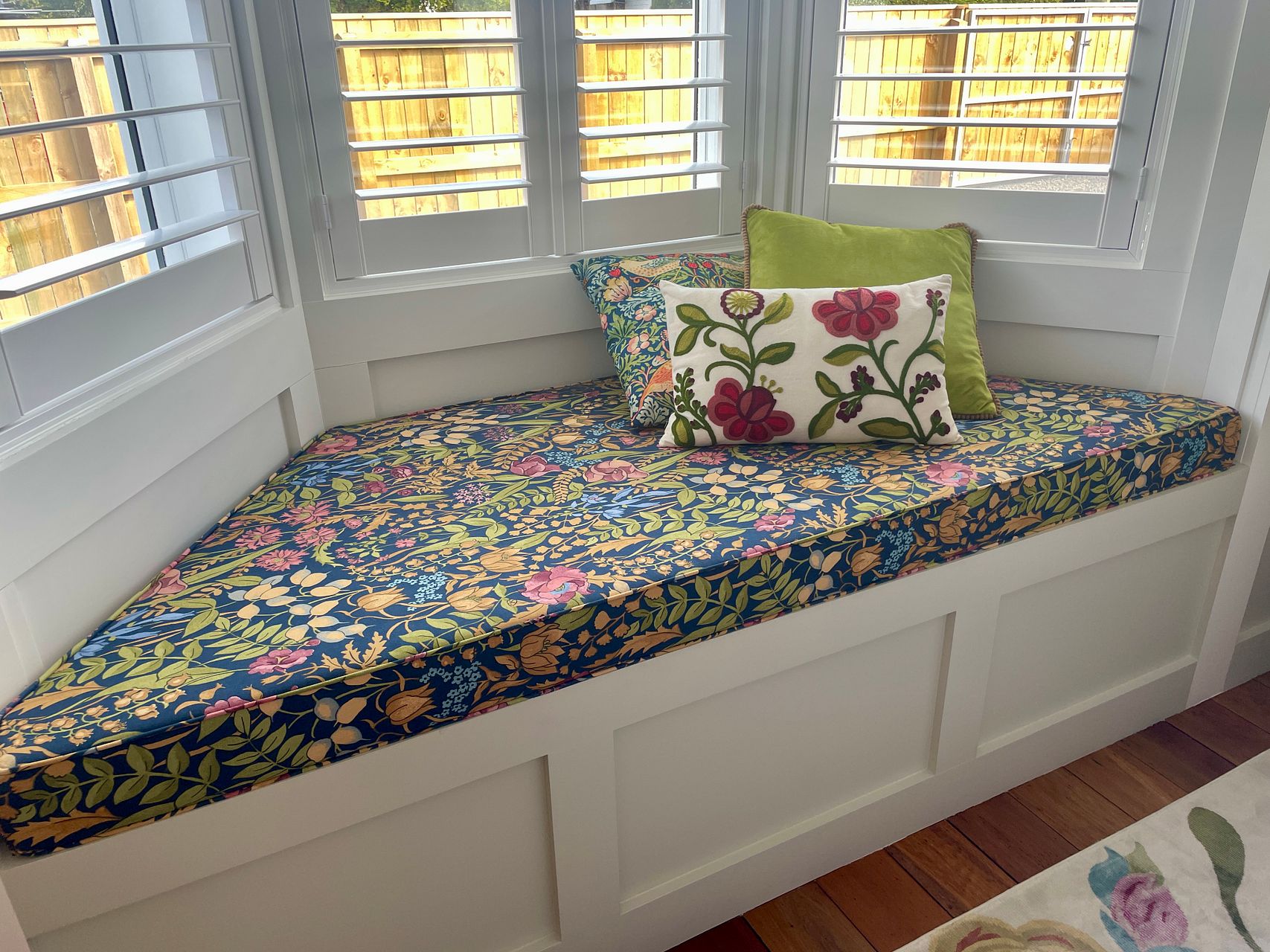 Two generous sized bedrooms featuring window shutters and one bay window and seat.