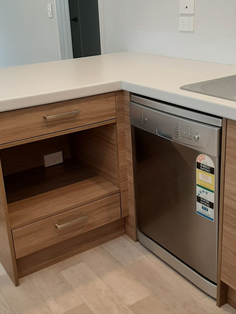 Lovely, compact kitchen with stainless steel Indesit wall oven, stainless steel dishwasher, and generous space for fridge and microwave.