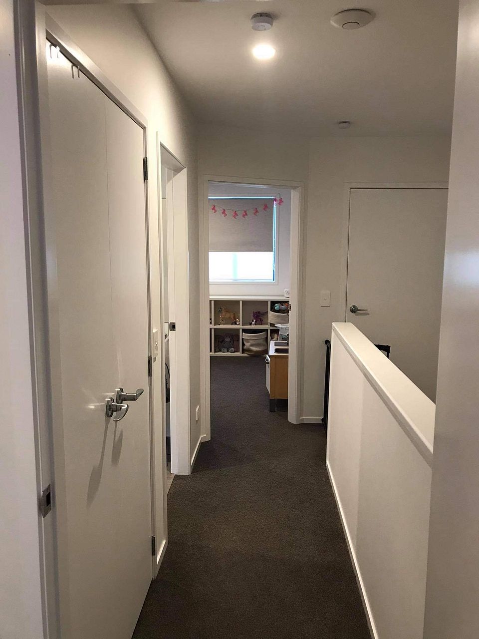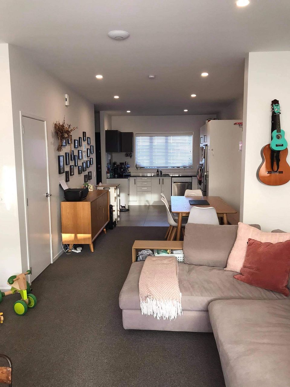 The ground level is open plan kitchen, dining and living. There’s a massive built in cabinet in the lounge as well as under stair cupboard and another heat pump.
