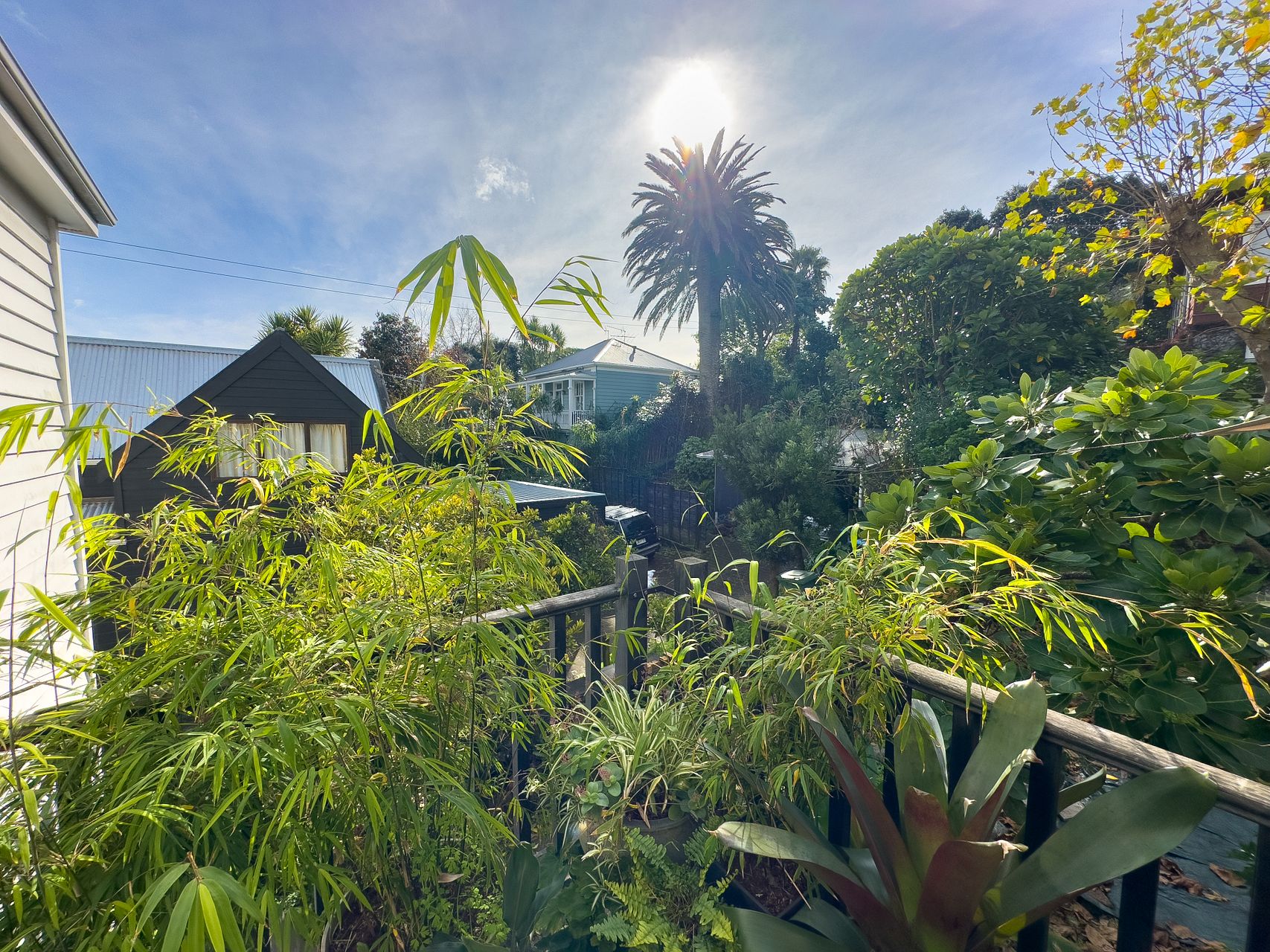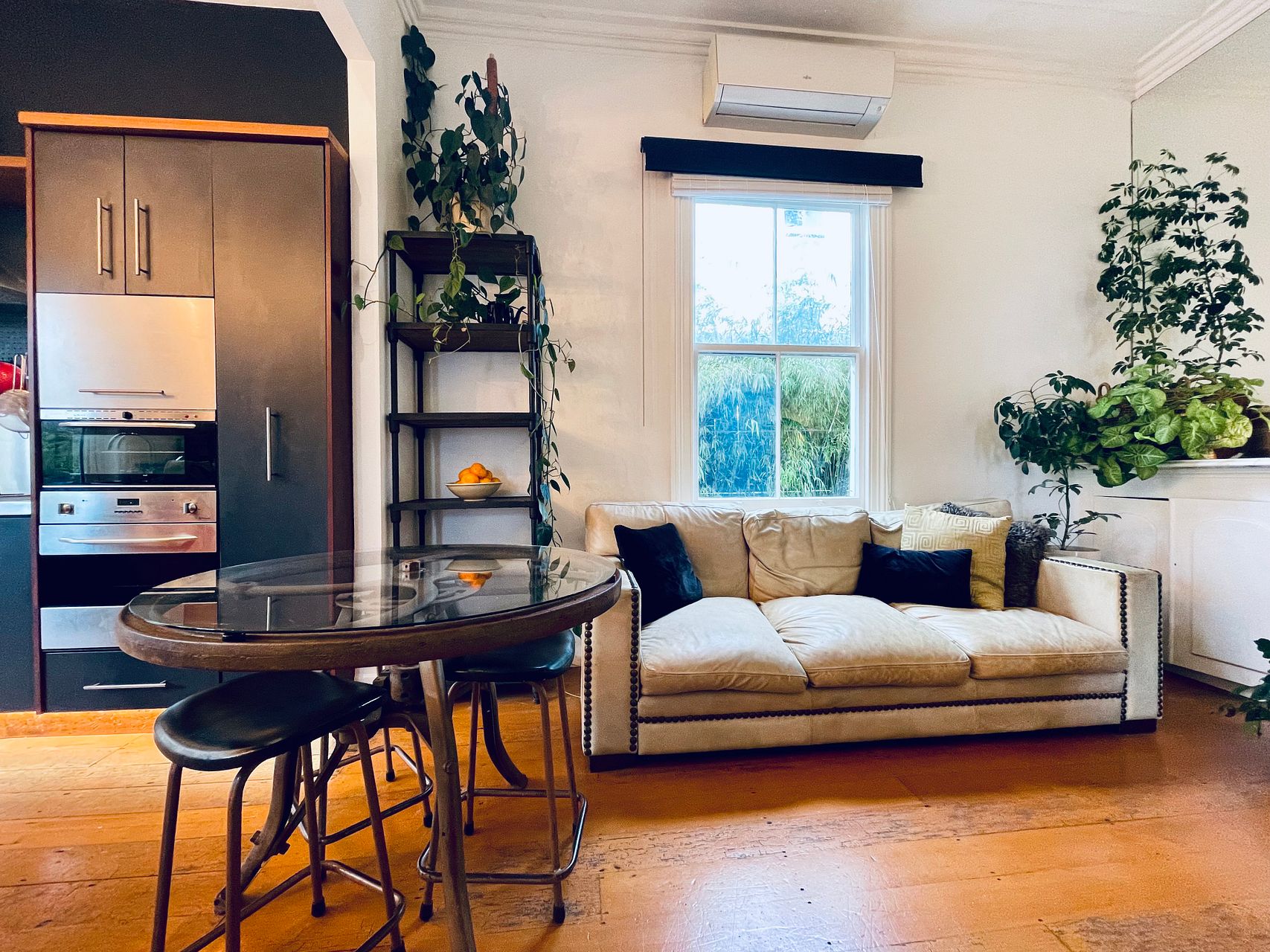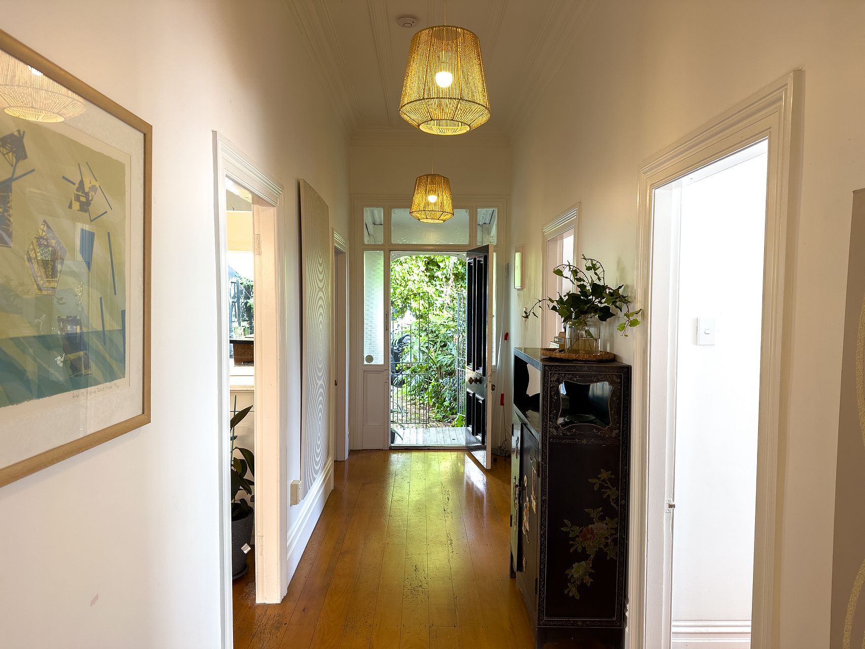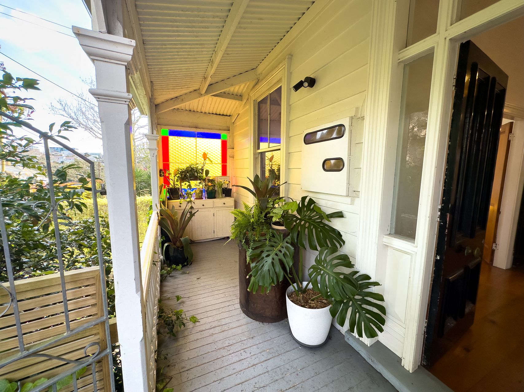 Elevated, sunny, cosy villa blends Victorian features with contemporary comforts and a dash of bohemia. Big bi-fold doors flow to back deck surrounded by lush tropical palms and trees.