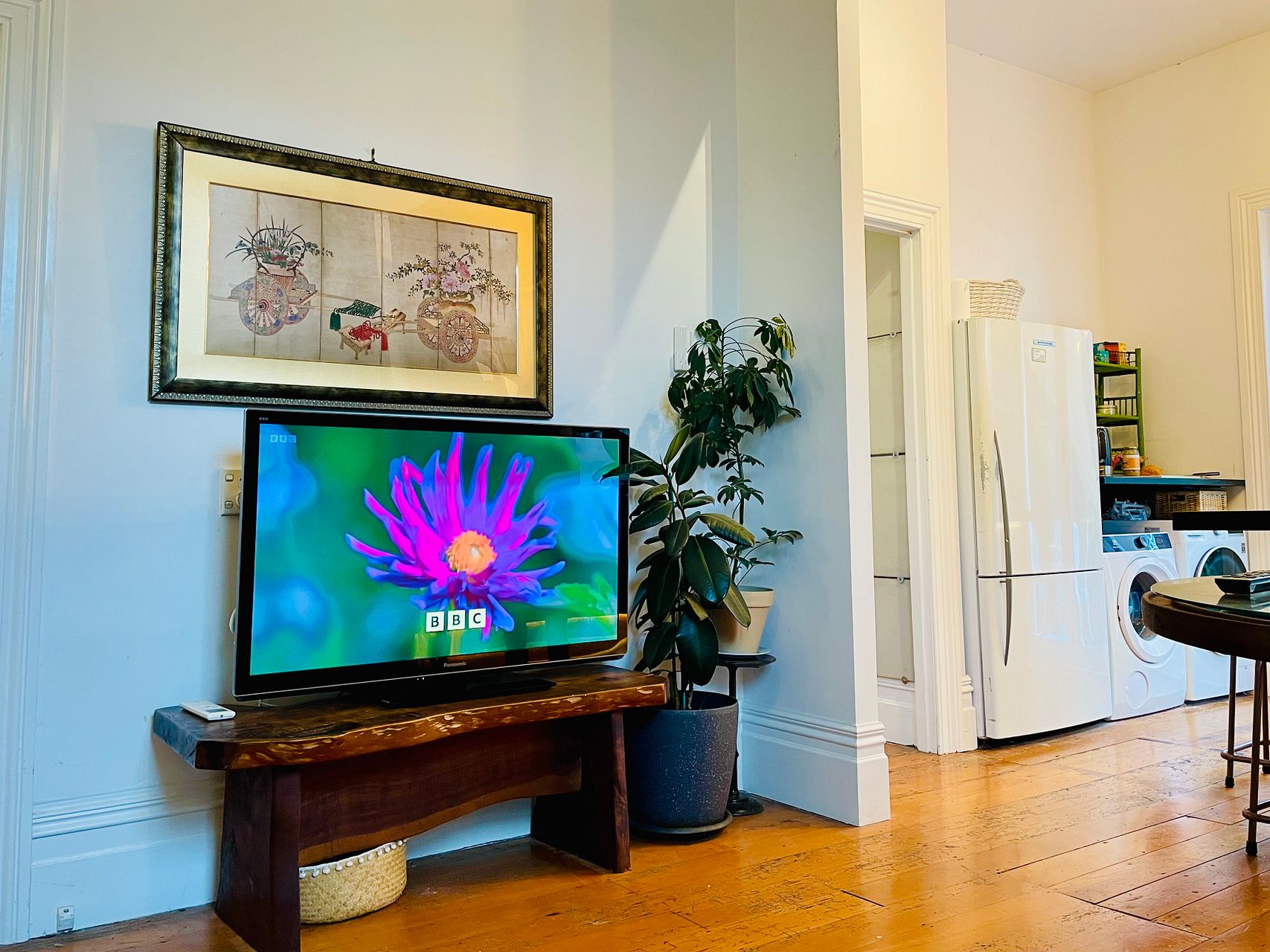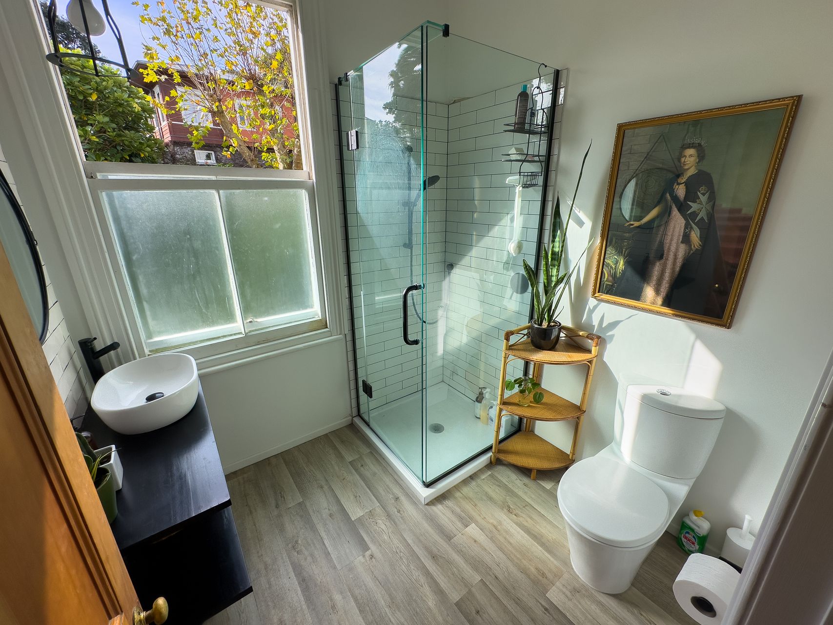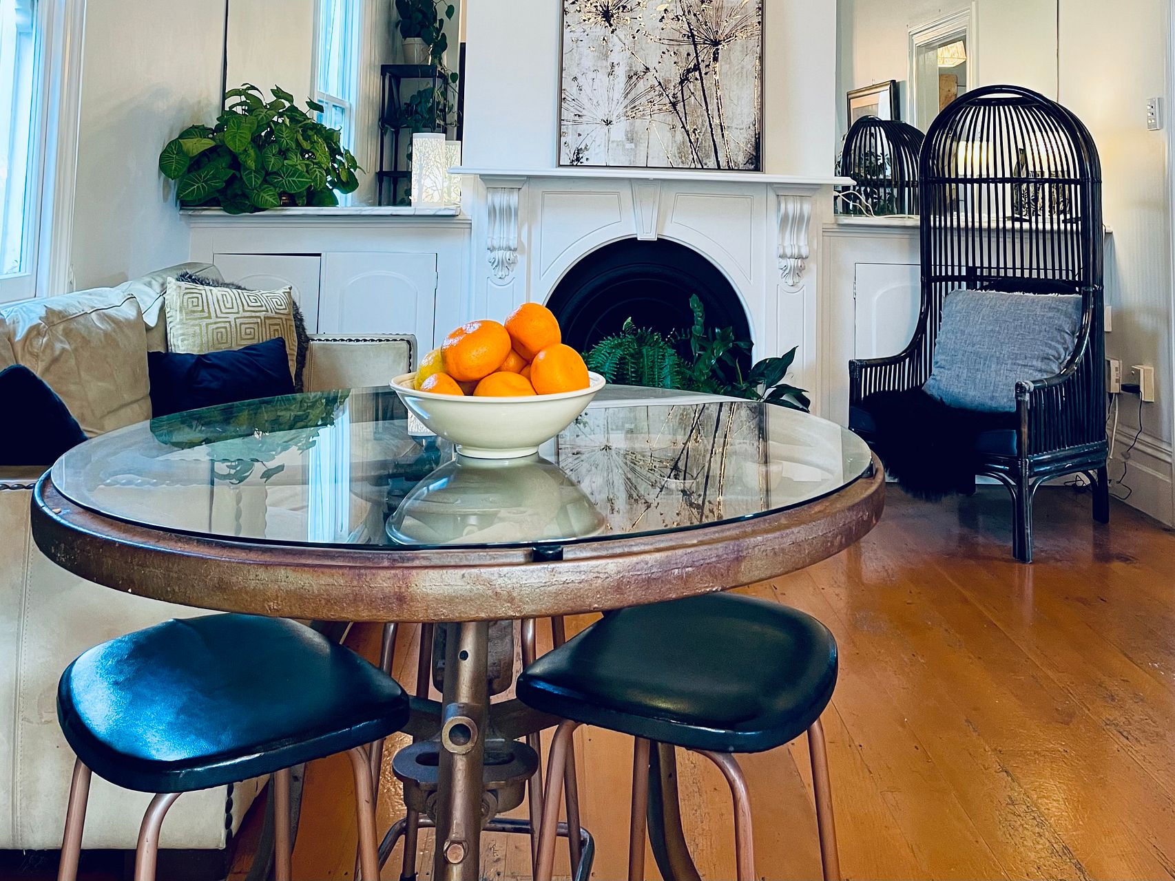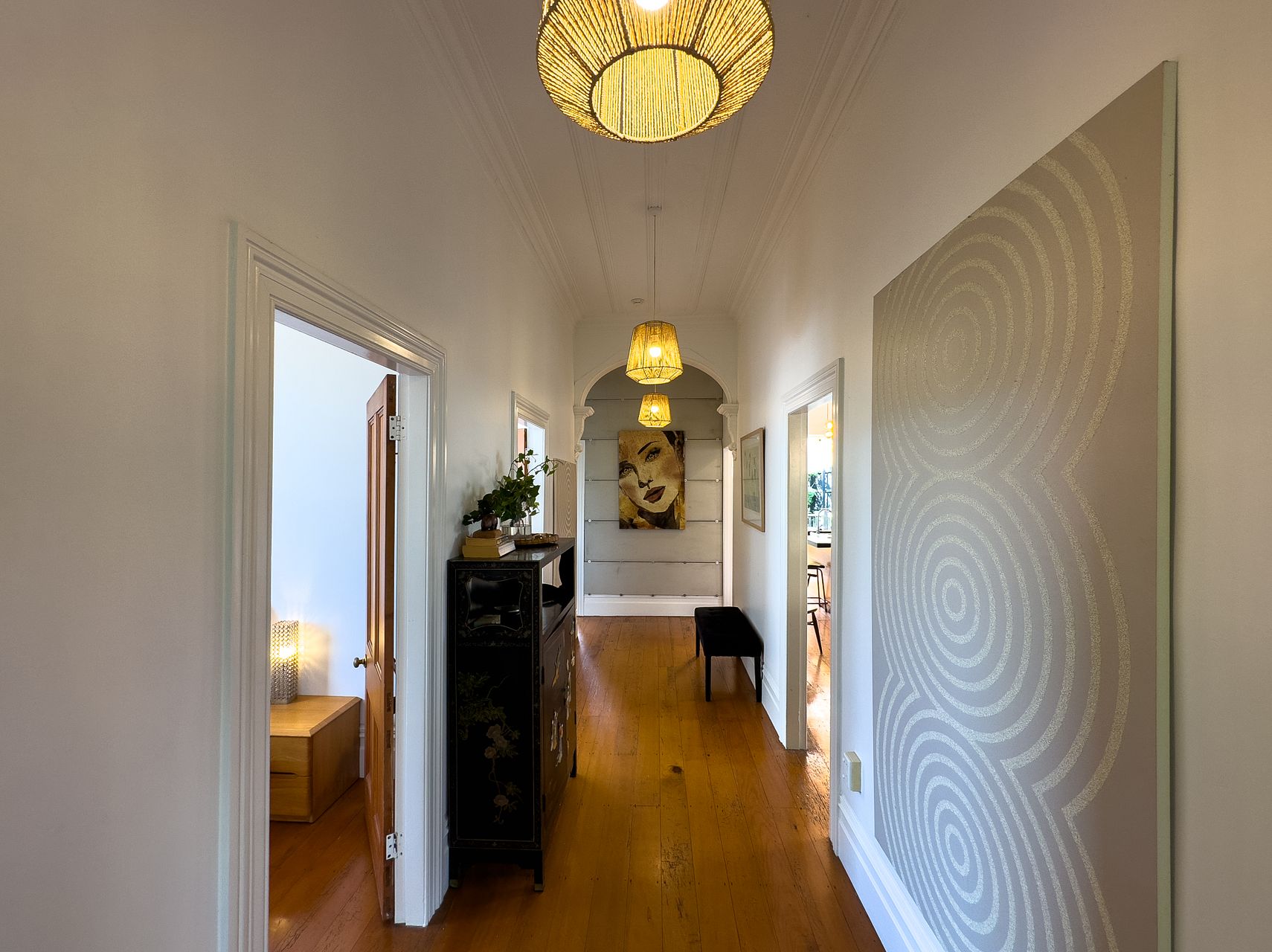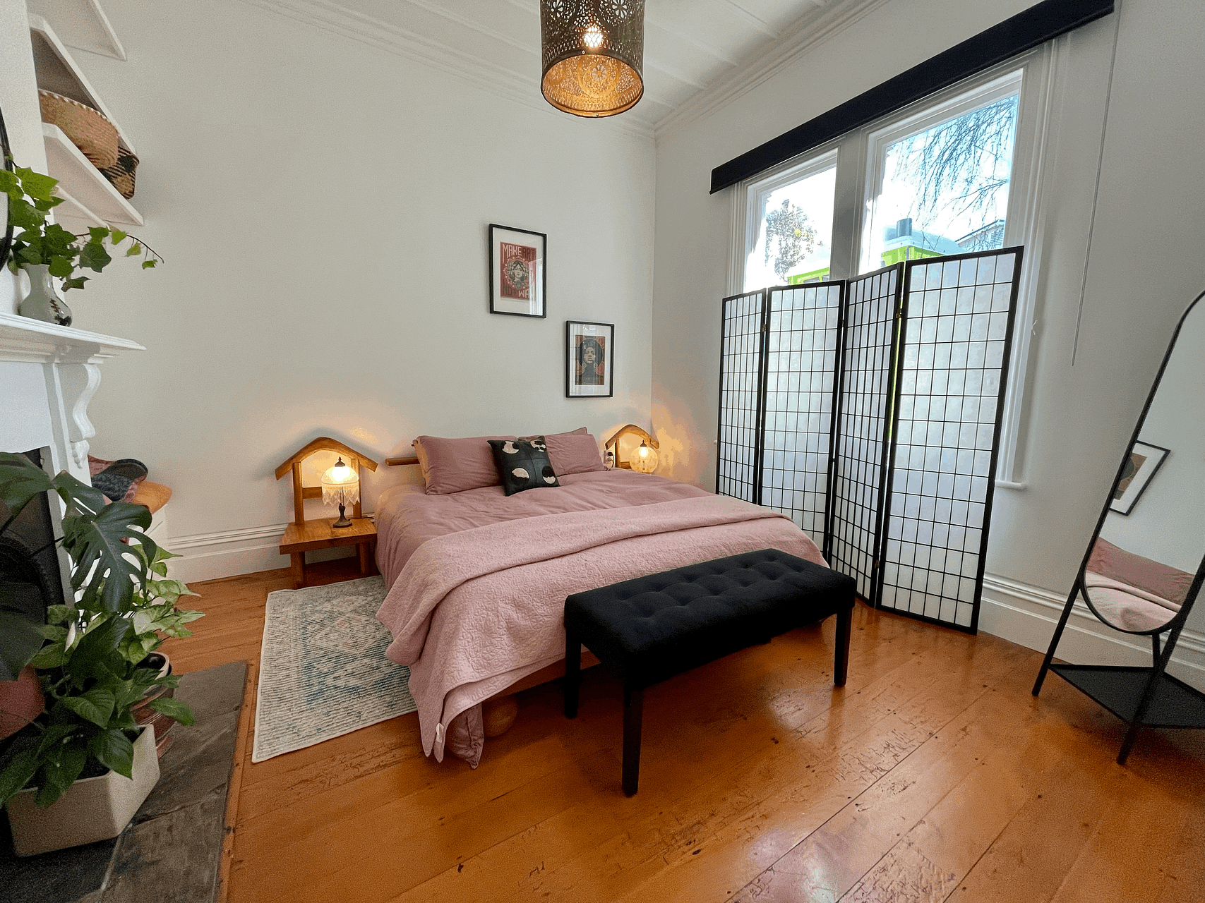 Elevated, sunny, cosy villa blends Victorian features with contemporary comforts and a dash of bohemia. Big bi-fold doors flow to back deck surrounded by lush tropical palms and trees.