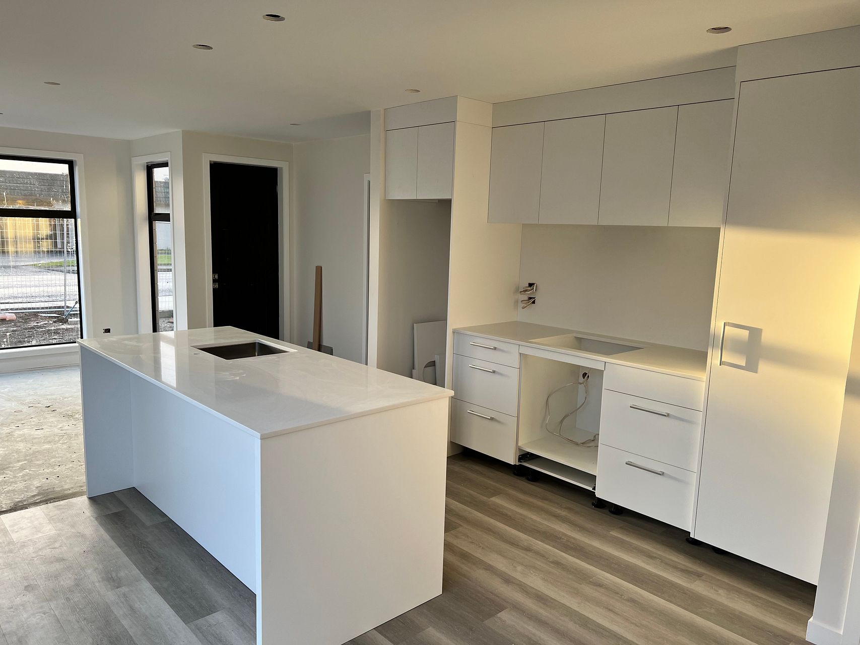A heatpump is centrally located in the open dining, kitchen & living area.