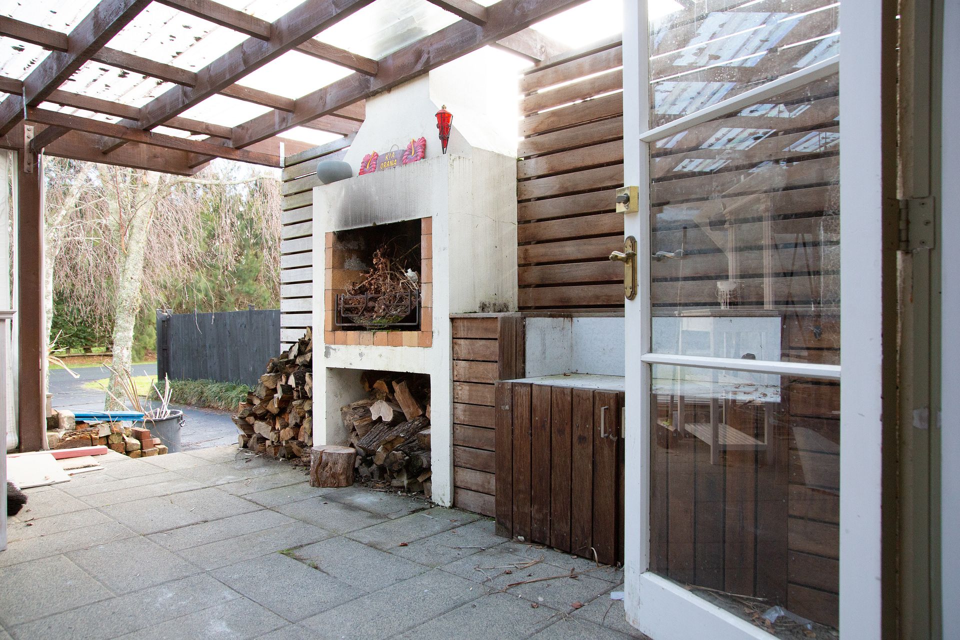 The key feature is the massive covered patio area which includes an outdoor fireplace.