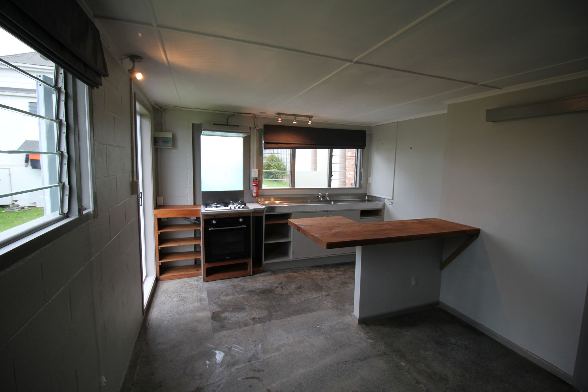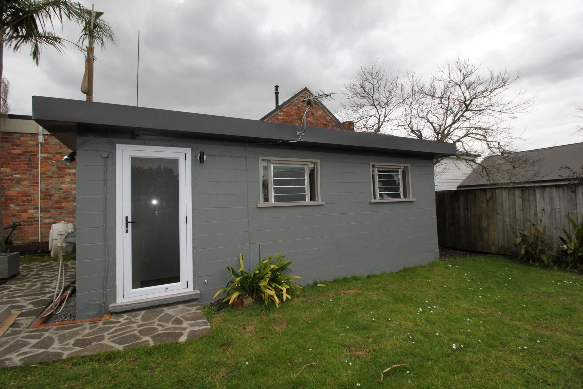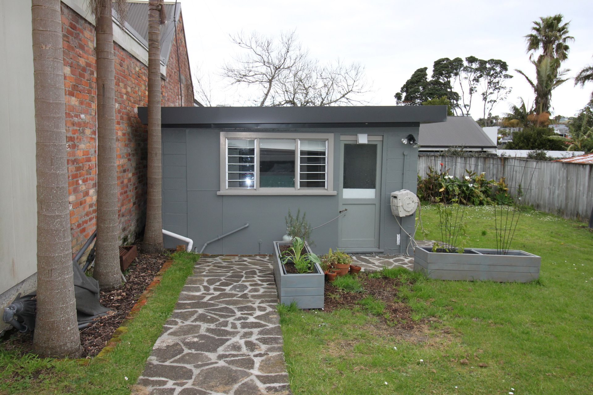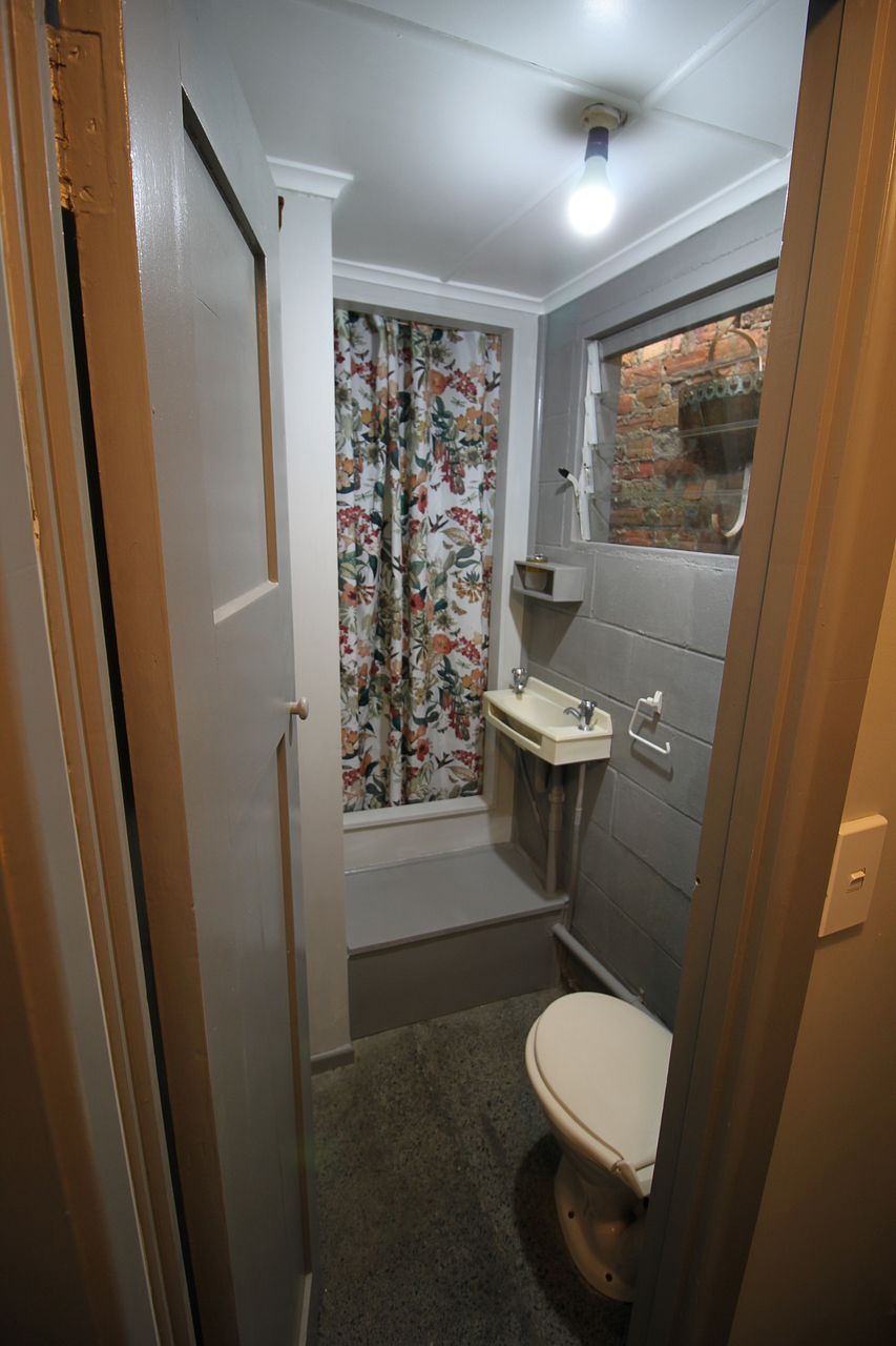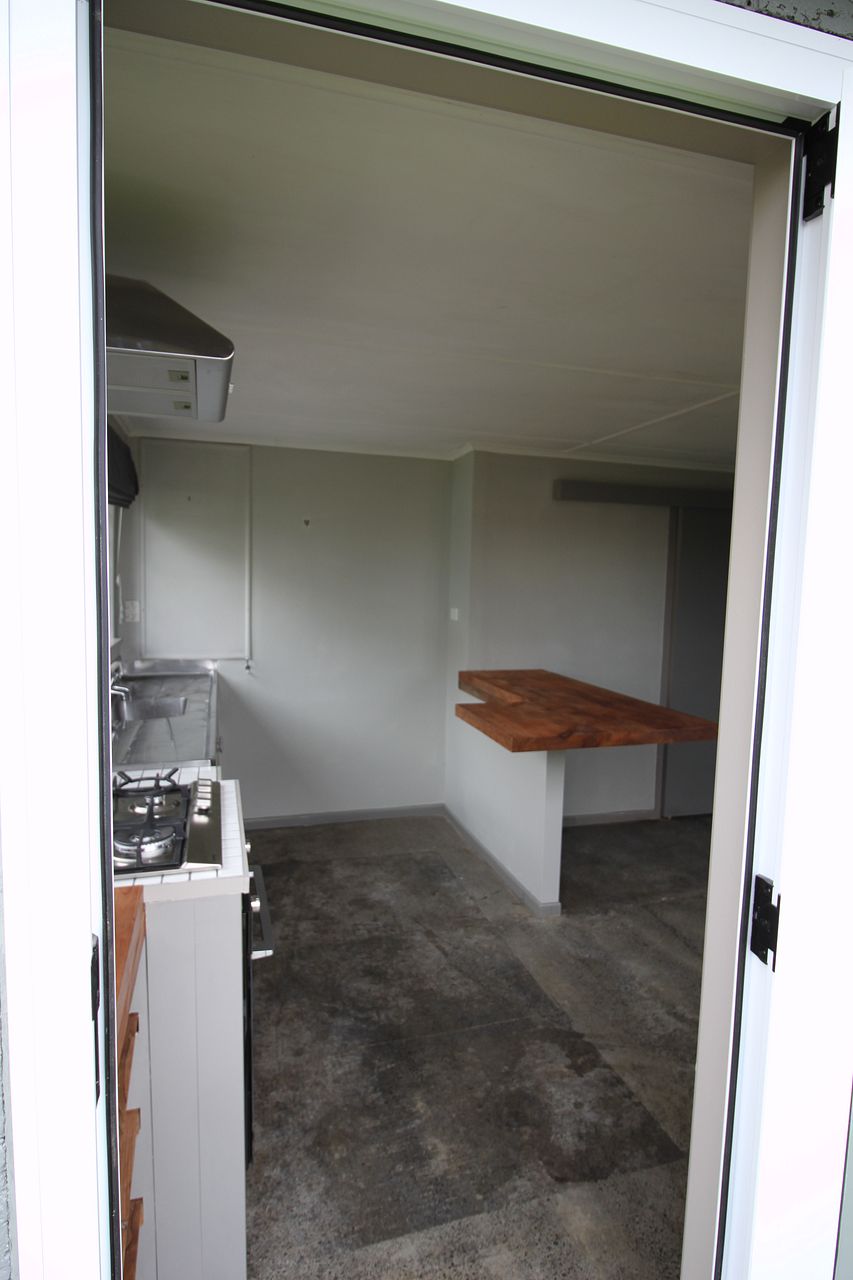 With a sunny outlook, there is a large separate bedroom and gets afternoon sun. It has a big backyard with lemon, mandarin and peach trees. Concrete polished floors and cinder block walls have been treated (this is not a damp space) and in winter it is very easy to heat.